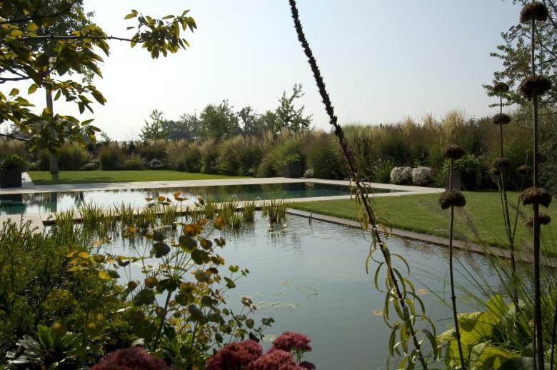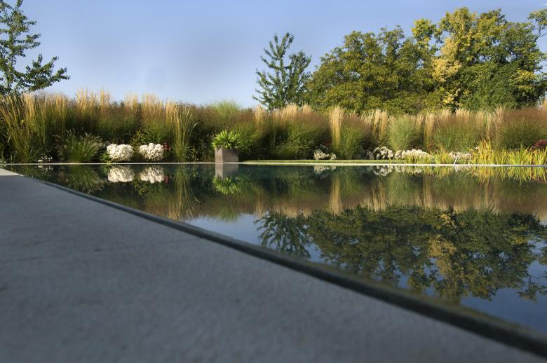 Den grössten Kontrast zu den strengen Kubaturen des Gebäudes bildet die üppige, naturhafte Gräserpflanzung, die über die Hälfte der Gartenfläche einnimmt und für Grosszügigkeit und Sichtschutz zugleich sorgt. Darin eingestreut stehen einzelne schirmförmige Felsenbirnen (Amelanchier lamarckii) und Judasbäume (Cercis silliquastrum). In diesem «Präriegarten» herrschen zwei farbliche Motive vor: weisse und zartgelbe sowie purpur und magentafarbene Gräser und Stauden. Dies entspricht dem Wunsch der Hausherrin nach einem weissen Garten und dem des Hausherrn nach intensiven, auffälligen Farbtönen. Die beiden Farbgruppen bilden zwei Bänder, die sich ineinander verwoben durch den Garten ziehen.