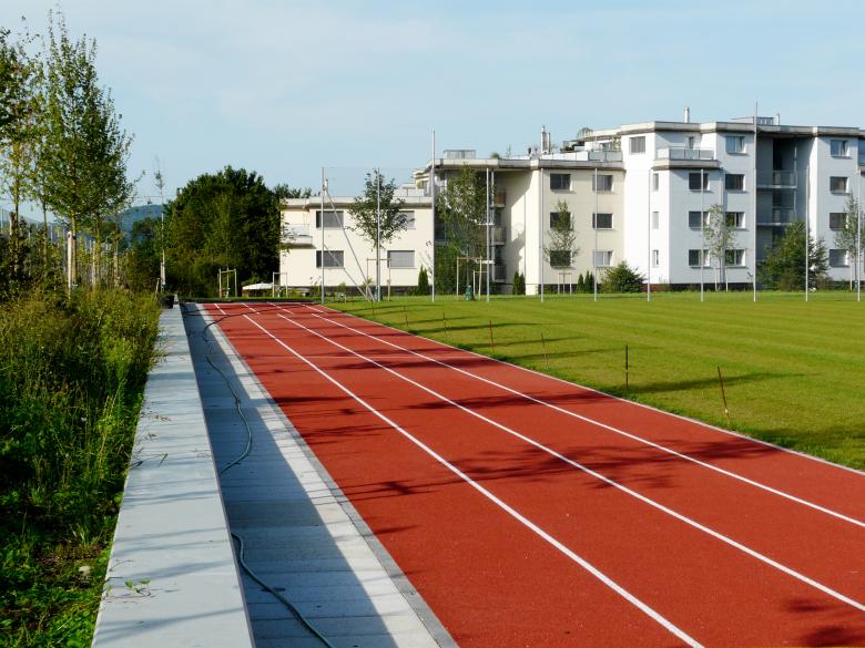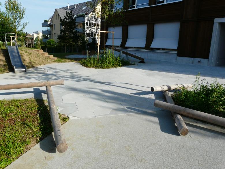Südöstlich des Ortskerns von Bassersdorf wurde inmitten eines bereits bebauten Siedlungsteppichs das neue Primarschulhaus Chrüzacker mit Kindergarten und Tagesschule errichtet. Durch die Setzung der Neubauten entlang des Bodenacherrings entfaltet sich um das Schulgebäude ein grosszügiger Aussenraum mit unterschiedlichen Freiraumtypologien für den Kindergarten und die Tagesschule. Der überdachten Eingangssituation am Bodenacherring ist ein Platz vorgelagert, der von einer grossen Sommerlinde beschattet wird. Der rückwärtige Bereich der Schule ist offen und verkehrsfrei und wird nur vom bestehenden Lärmschutzwall zur Zürcherstrasse begrenzt. Wir verstärken die Offenheit der Grünflächen entlang des gesamten Perimeters durch einen feinen Gehölzschleier, der Rückzugsmöglichkeiten und Raum für Infrastrukturen bietet, wie zum Beispiel für die Velounterstände. Identitätsstiftende Solitärbäume und Baumgruppen sorgen für jahreszeitliche Kontraste und lockern den sonst bewusst schlicht gehaltenen Pausenbereich mit Rasenspielfläche, Allwetterplatz und Laufbahn auf. Der abwechslungsreiche Kindergartenspielplatz ist über einen direkten Zugang von aussen erreichbar.