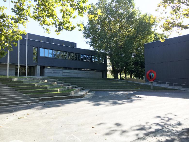 Die terrassierte Anlage mit den gutproportionierten Aufenthaltsbereichen bietet gleichzeitig Offenheit, aber auch intimere Nischen. Der zentrale Platz mit der Rasensitztreppe fügt sich optimal in die Landschaft ein und bleibt mit dem Kunstwerk das Herz der Anlage.