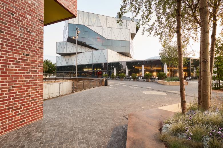 Mit dem Erweiterungsbau des Forschungszentrums Experimenta haben die Außenanlagen auf der Neckarinsel eine neue Raumqualität bekommen. Mit einer großzügigen Geste betten wir das Gebäudeensemble in einen neuen Kontext ein, der die einzelnen Freiflächenbereiche über einen einheitlichen Wege- und Platzbelag verbindet. Die zentralen Platzflächen werden im Norden und Süden von ausgedehnten Wiesenflächen eingerahmt, die den Übergang zum Neckarpark bilden. Baumpflanzungen begleiten die Fußgänger und Fußgängerinnen auf dem Weg zur zentralen Platzfläche, die als Eingangsfläche, Vorfahrt und zur Anlieferung dient und so die optische und funktionale Verbindung zwischen den beiden Gebäuden herstellt. Splitterförmige Intarsien im Platzbelag greifen die charakteristische Formensprache des Neubaus auf. Einige »Splitter« erheben sich dreidimensional aus dem Belag heraus und formen als Sitzelemente einladende Aufenthaltsbereiche unter dem schattigen Blätterdach. Die bodenbündigen Intarsien schreiben die charakteristische Formensprache fort, regen zur vielfältigen Nutzung des Platzes an und integrieren auf außergewöhnliche Art und Weise ein Blindenleitsystem. Am Wasser bilden Sitzstufen einen attraktiven Aufenthaltsbereich in Fortführung der historischen Ufermauern.