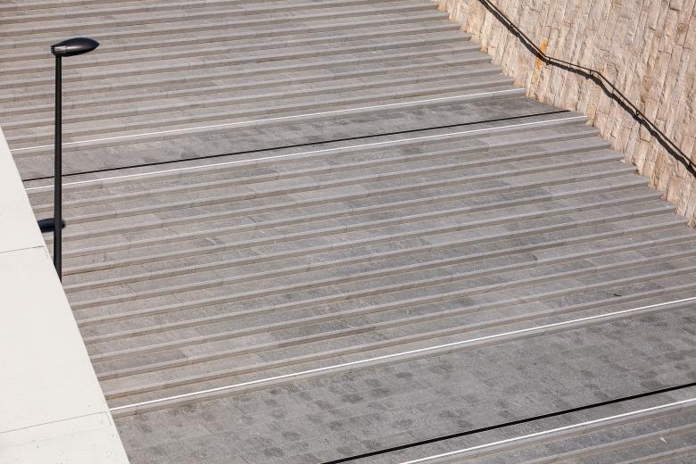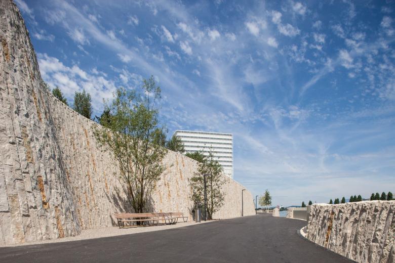 Die Gestaltung orientiert sich an den Strömungsmustern des Flusses, die ihre Fortsetzung in den zur Überbrückung des Höhenunterschiedes notwendigen Mauern finden. Sie nehmen die geschwungenen Bewegungen auf und führen sie in den Wegbereichen weiter. Wie selbstverständlich verweben sich die integrierten Treppen und Rampen mit den Mauern und stellen die Verbindungen zwischen den einzelnen Höhenlevels her. Vertikal angeordnete, gebrochene Kalksteinbänder verleihen dem Uferabschnitt einen warmen, textilen Ausdruck.