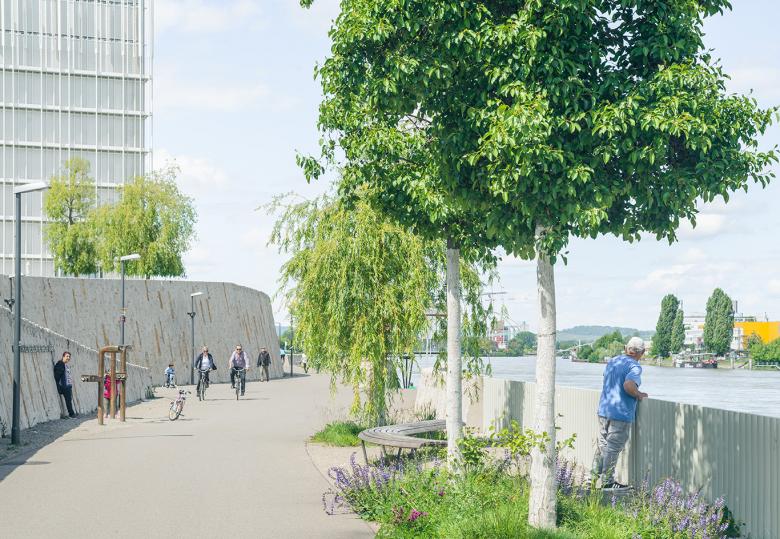 Durch die Herausforderungen der globalen Erwärmung stehen Städte und Gemeinden unter einem zunehmenden Handlungsdruck. Zurzeit erörtert die Stadt Basel verschiedene Möglichkeiten, ihre Freiflächen besser an den Klimawandel anzupassen. Im Rahmen eines Gutachtens haben wir untersucht, wie die Begrünung der Rheinuferpromenade nachträglich verdichtet werden kann, um ein gemässigtes Lokalklima zu fördern. Dementsprechend haben wir auf der Ebene des Promenadenweges neue Baumstandorte festgelegt, mit denen die bestehenden Baumgruppen sinnvoll ergänzt werden können. Als standortgerechte Baumarten stehen trocken- und hitzetolerante Arten aus dem Lebensbereich der Trockenwälder zur Auswahl. Gleichzeitig besteht die Möglichkeit, die nicht befestigten Flächen entlang der Promenade stellenweise zu erweitern und durch Einarbeiten von Oberboden und Einsaat zu einer Wildblumenwiese zu entwickeln. Am unteren Bermenweg können aufgrund der alten, unterirdischen Hafenmauer keine Bäume gepflanzt werden. Auf den wassernahen Buhnen direkt am Rhein ist es jedoch möglich, vermehrt Weiden anzupflanzen.