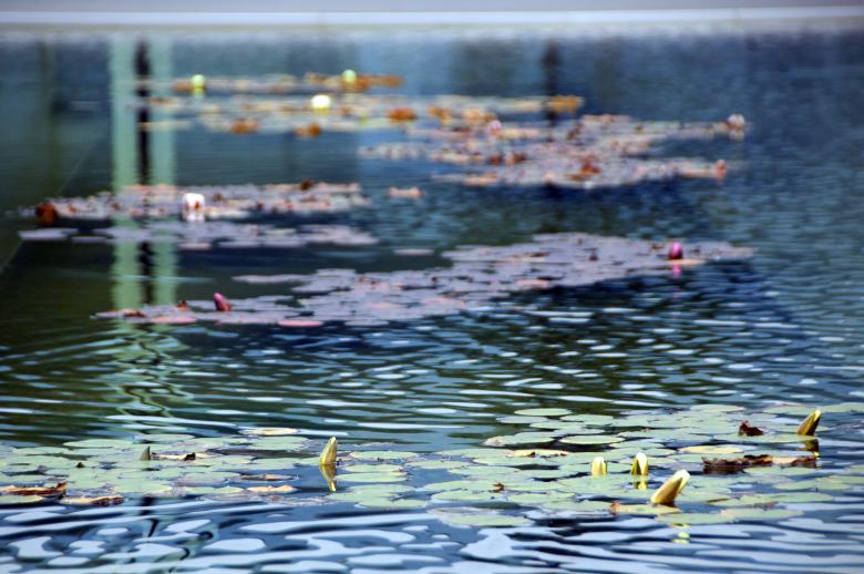 Der Blick schweift über den Wasserspiegel mit den Seerosen, über das fein abgestimmte Farben- und Formenspiel der Gräser und Schwertlilien bis hin zu den Baumreihen am Parkplatz vor den Ausstellungshallen. Die Bäume bilden den übergreifenden Rahmen entlang der Verkehrsflächen, bewaldete Hügel runden die Szenerie im Hintergrund ab.