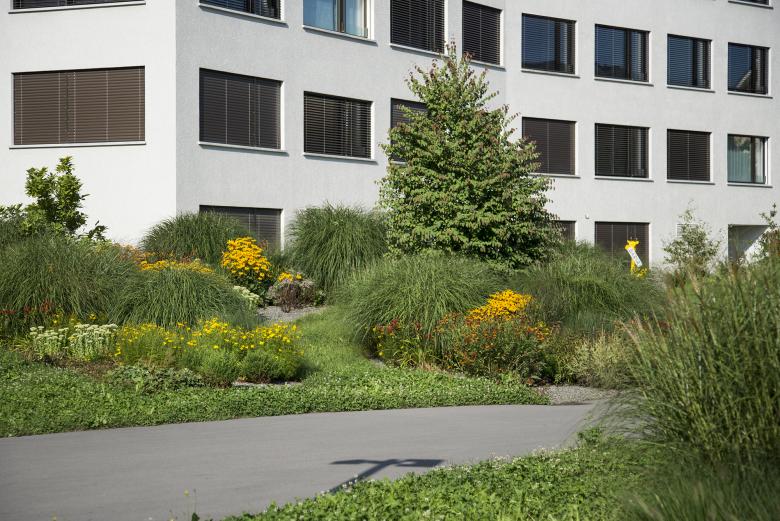 Für unser Freiraumkonzept haben wir aus den Potenzialen der Zuger Landschaft einen adressbildenden Aussenraum für das neue Wohnquartier Suurstoffi in Rotkreuz abgeleitet. Als vorherrschende Gestaltungselemente verwenden wir Wasser, Topographie und Pflanzen. Sie werden zu einem ornamentalen Muster zusammengesetzt, das eine Abstraktion der umgebenden Zuger Landschaft darstellt. Das daraus entwickelte «Landschaftsornament» steht in der Tradition der Millefleurs-Dekors auf den Wandteppichen des Mittelalters, die mit üppiger Blumenpracht von duftenden, farbenfrohen Orten und Paradiesgärten erzählen. Die Grundlage dieser «Millefleurs» bildet ein durchgehender Rasenteppich, der die Verbindung zwischen allen Räumen herstellt. Im «Gartenteppich» tragen grosszügige Graspflanzungen aus sanften Mulden und leichten Erhöhungen zusammen mit üppigen Staudenpflanzungen dazu bei, eine eindeutige Atmosphäre zu erschaffen, die sachlich und sinnlich zugleich ist. Entlang des «Boulevards» wird Wasser als belebendes Element eingeführt. So treffen die Bewohner und Bewohnerinnen - eingewoben in das Bild der «Millefleurs» aus bunten Blumen, Gräsern und weiten Wasserflächen - auf eine Vielzahl von besonderen Orten, die zur abwechslungsreichen Benutzung auffordern.