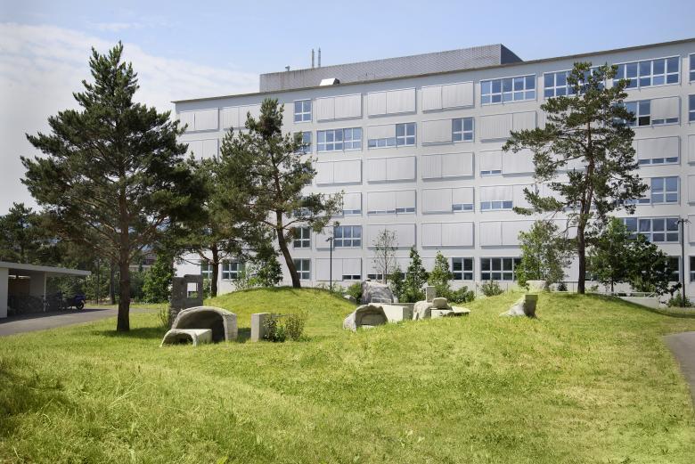 Im Hof der beiden abgewinkelten Wohnbauten von Gigon Guyer Architekten haben wir Rasenhügel auf die Tiefgarage gesetzt, um darauf zehn grosse Kiefern zu pflanzen. Das Künstlerduo Lutz & Guggisberg schafft mit einem Ensemble aus skurrilen, bespielbaren Beton-Skulpturen die Hauptattraktion im Wohnhof. Rund um die Gebäude blühen Wiesen unter locker verteilten Eichen. Unsere ländlich anmutende Gestaltung steht im bewussten Kontrast zu den gewaltigen Gebäuden.