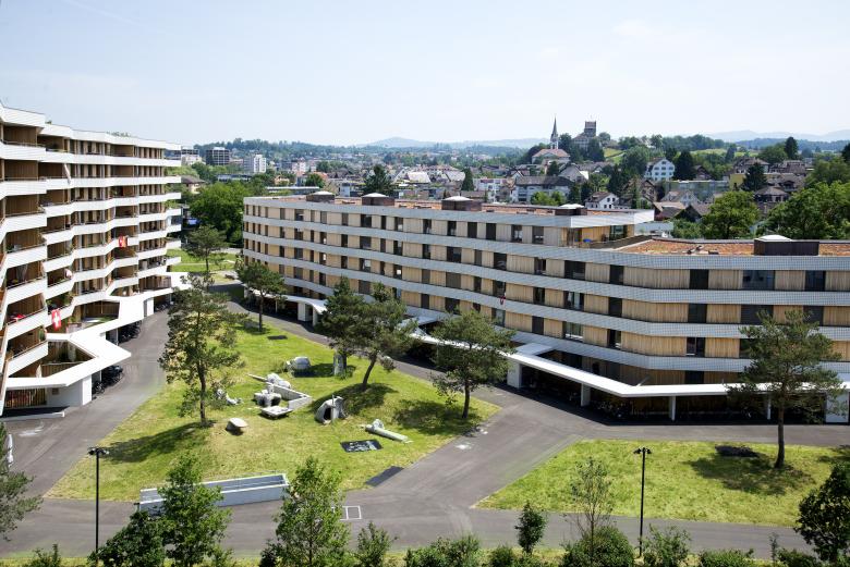 Zwischen dem mächtigen Rohn-Bau und einem der naturnahen Weiher liegt ein Wohnturm von Herzog & de Meuron Architekten. Die in die Blumenwiese eingestreuten Silberpappeln werden den imposanten Bau mit den Jahren noch näher mit der Natur verwachsen lassen.