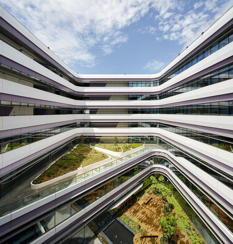The overall design forms a response to the natural landscape of Singapore, both through colour application and through the incorporation of facade planters, green roof terraces and sky gardens and numerous green pockets planted with native trees and flowering plants.
