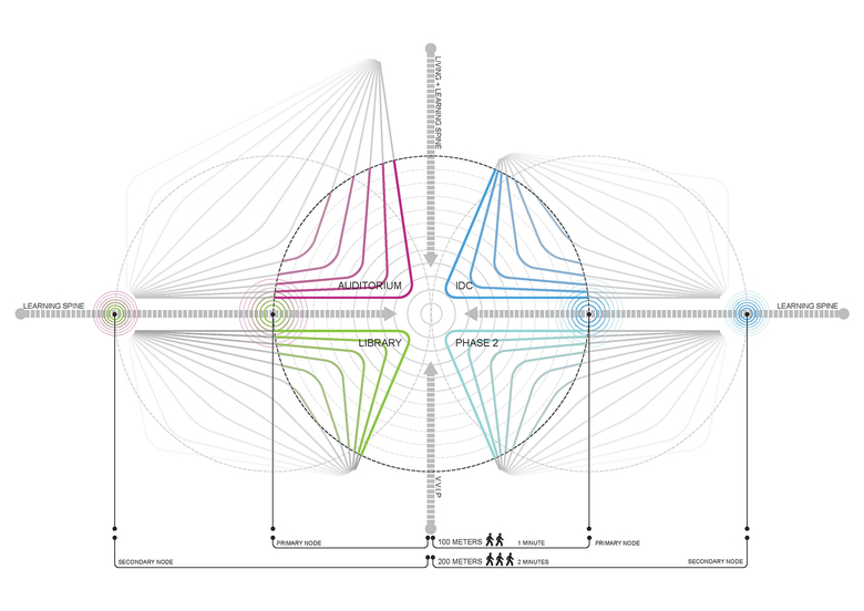The spatial configuration of the academic campus generates a seamless network of education, a 24/7 campus which enhances direct interaction through both proximity and transparency.