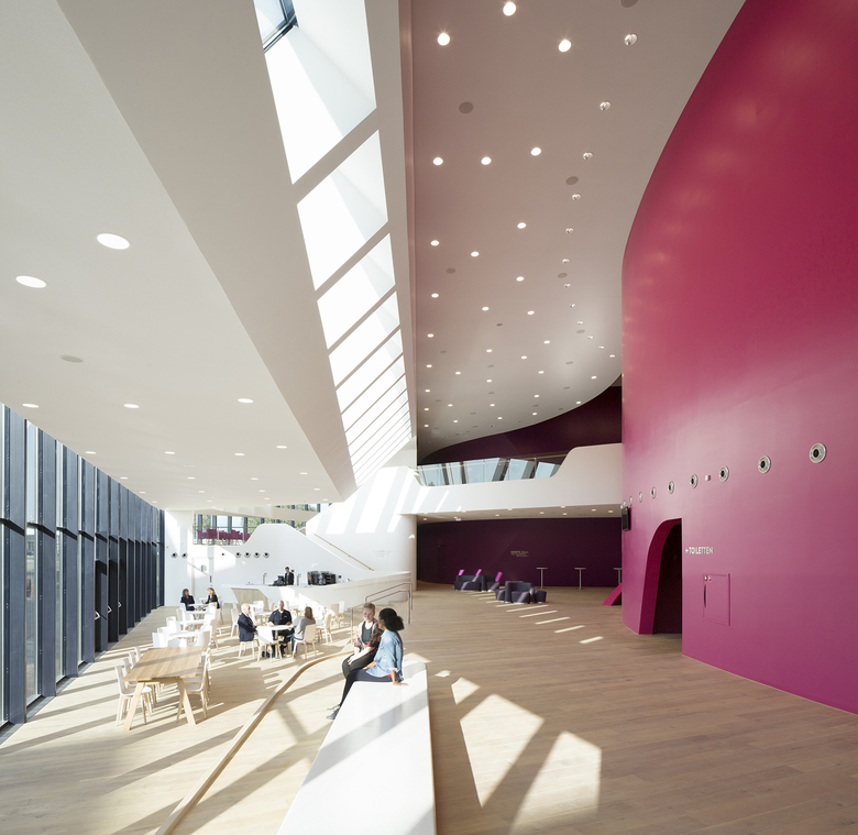 Light and colour – Light and colour play an essential role in the experience of the theatre, not only in the auditoria and for productions, but also for setting the scene, the atmosphere and the mood in the public foyers. During the day the lower glass portion of the facade enables daylight penetration directly from both the front of the theatre and from above, throwing daylight deep into the foyer and above the stairs leading to the auditoria. In the evening a warm and inviting atmosphere is created through the use of both colour and artificial lighting.