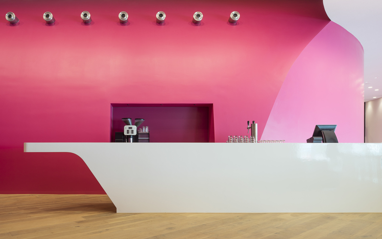 Above the glazed lower levels of the facade, the upper portion comprises two layers of aluminium, Glimpses of the purple coloured back layer can be seen through circular perforations in the outer white panels, with LED lights fitted between the two facade layers to light the building in the evenings.