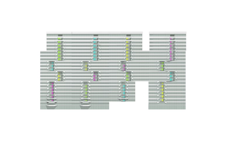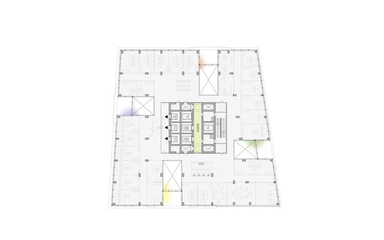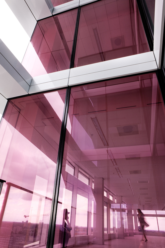 Custom coloured glass panes are incorporated into the vertical voids, offering different identities and light qualities to the communal spaces which surround each void in the interior. These voids further facilitate daylight penetration deep into the extensive 40m x 40m floors. Voids are often placed at the center of a building, but here they are placed at the perimeters. This has three major advantages: