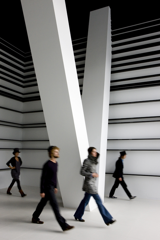 UNStudio Tower – The façade of the UNStudio Tower plays with the juxtaposition of a horizontal and vertical articulation, conceptually relating to the principles upon which the moiré effect is based. The horizontal articulation is provided by white, aluminium bands which wrap the tower, whilst their varying size, depth and transparency ensure the correct balance of sun screening and light penetration to the interiors on all levels of the building. Vertical accents are formed by voids, recessed into each face of the building and spanning differing numbers of floors. These voids serve to create an inside-outside relationship which extends the façade envelope and turns the surface of the tower into an active medium with a profound effect on the quality of the interior user space.