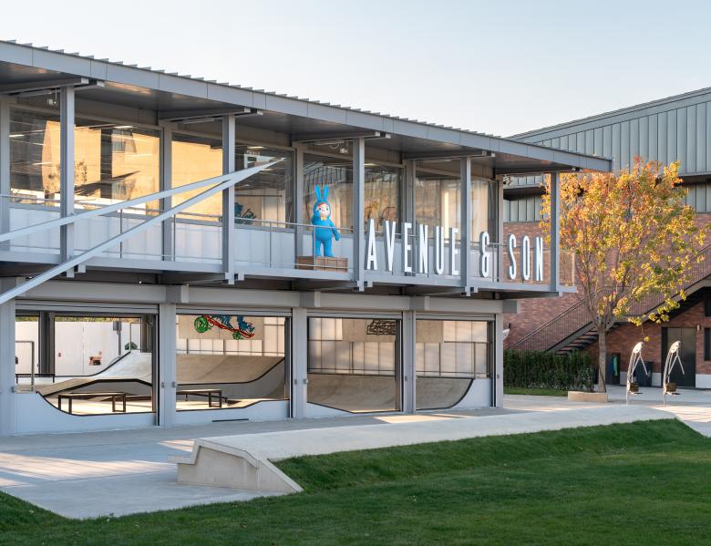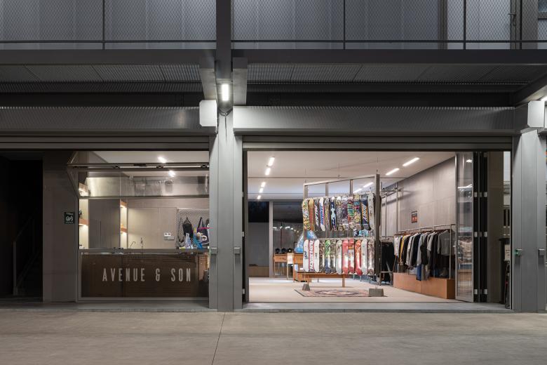 The AVENUE&SON store continues the building’s clean industrial aesthetic. Despite limited budget and time, Various Associates sought to present a cohesive vision of street culture. Minimalist design language and reused display fixtures from the brand’s previous pop-ups create a clean, relaxed street atmosphere.