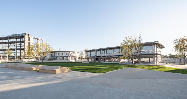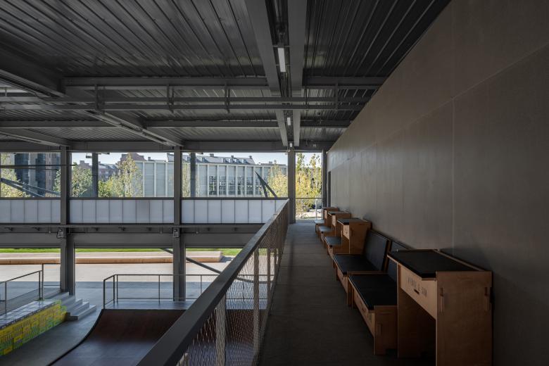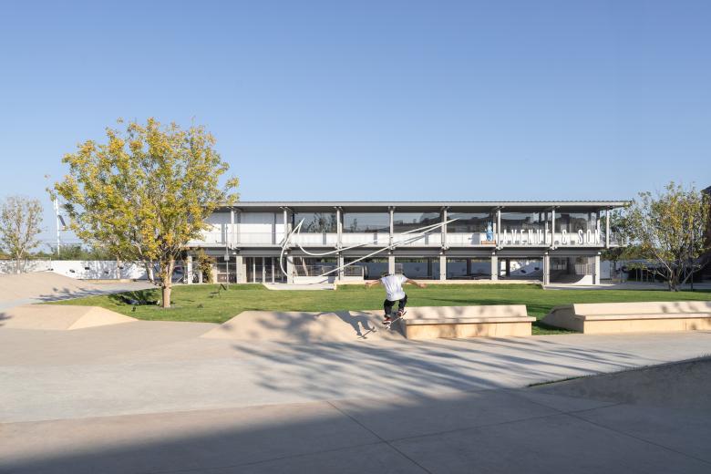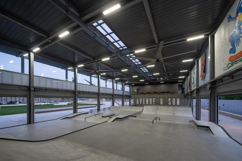 To reduce environmental impact and operational costs, the indoor skatepark employs a lightweight steel structure. The curtain walls feature roll-up fireproof shutters that can be opened in favorable weather, allowing natural airflow and seamless connection with the outdoor skatepark. Large ceiling fans provide thermal comfort in the hot summer. Additional facilities include a dance studio, storage areas, and indoor and outdoor spectator stands, supporting training and community engagement.
