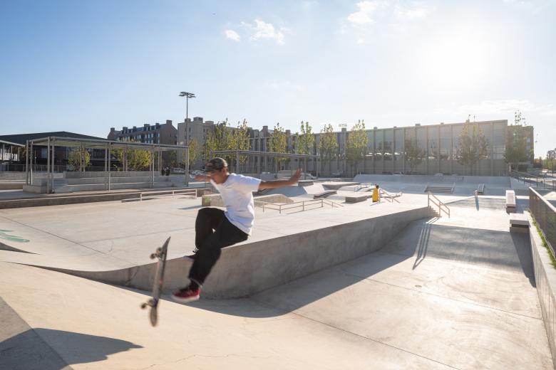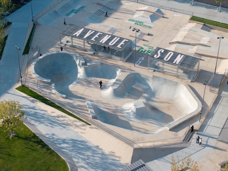 To accommodate everyday use, the skatepark’s boundaries are softened into a park landscape. Through carefully sculpted terrain and fluid contours, professional facilities blend seamlessly with pathways and lawns, transforming skate ramps and bowls into sculptures that seem to grow from the land. As sunlight filters through the trees and casts dappled shadows across the concrete ramps, sport and nature converge in harmony.