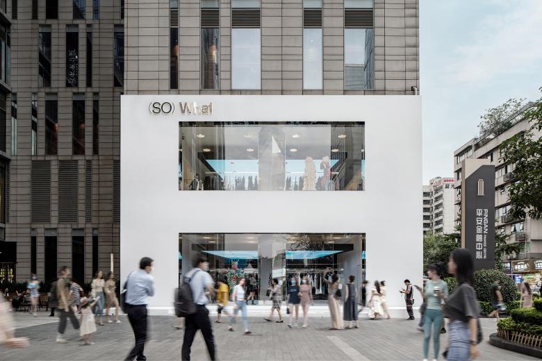 The project faces the northwest of Taikoo li across the street, with a steady stream of people passing the door. Without barriers at the front, the square double-height facade offers pedestrians a direct view to the store from a distance. The special geographical location forms a favorable spatial relationship for optimizing the view and interaction.