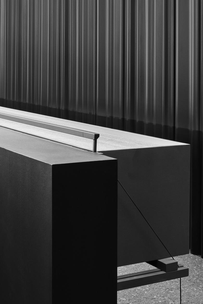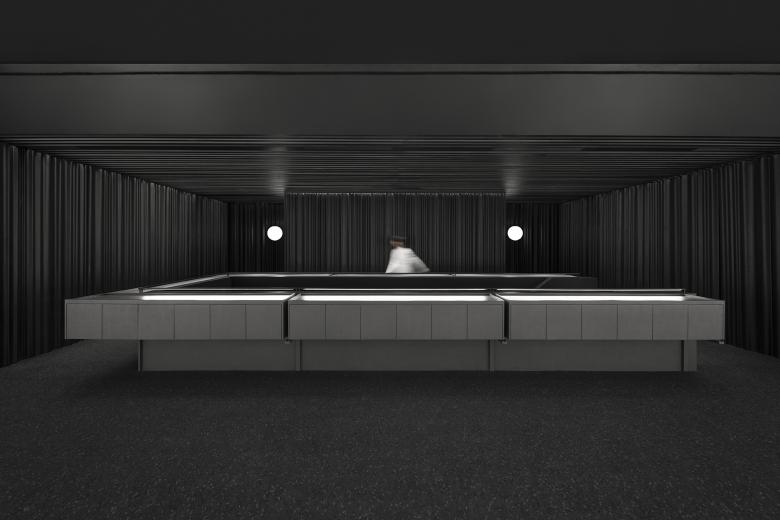 The geometric forms are complemented by black and white hues. The mirrored black area generates a multilayer space with illusionary reflections, producing a breathing and dramatic spatial experience.
