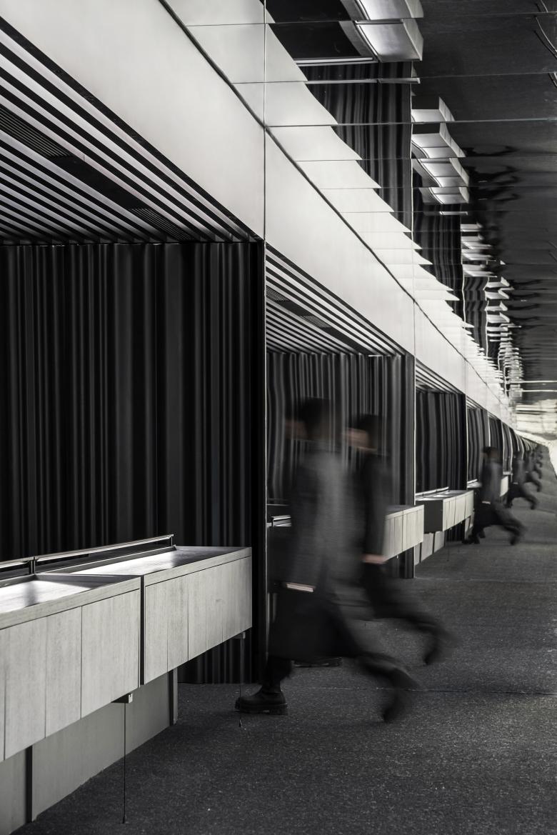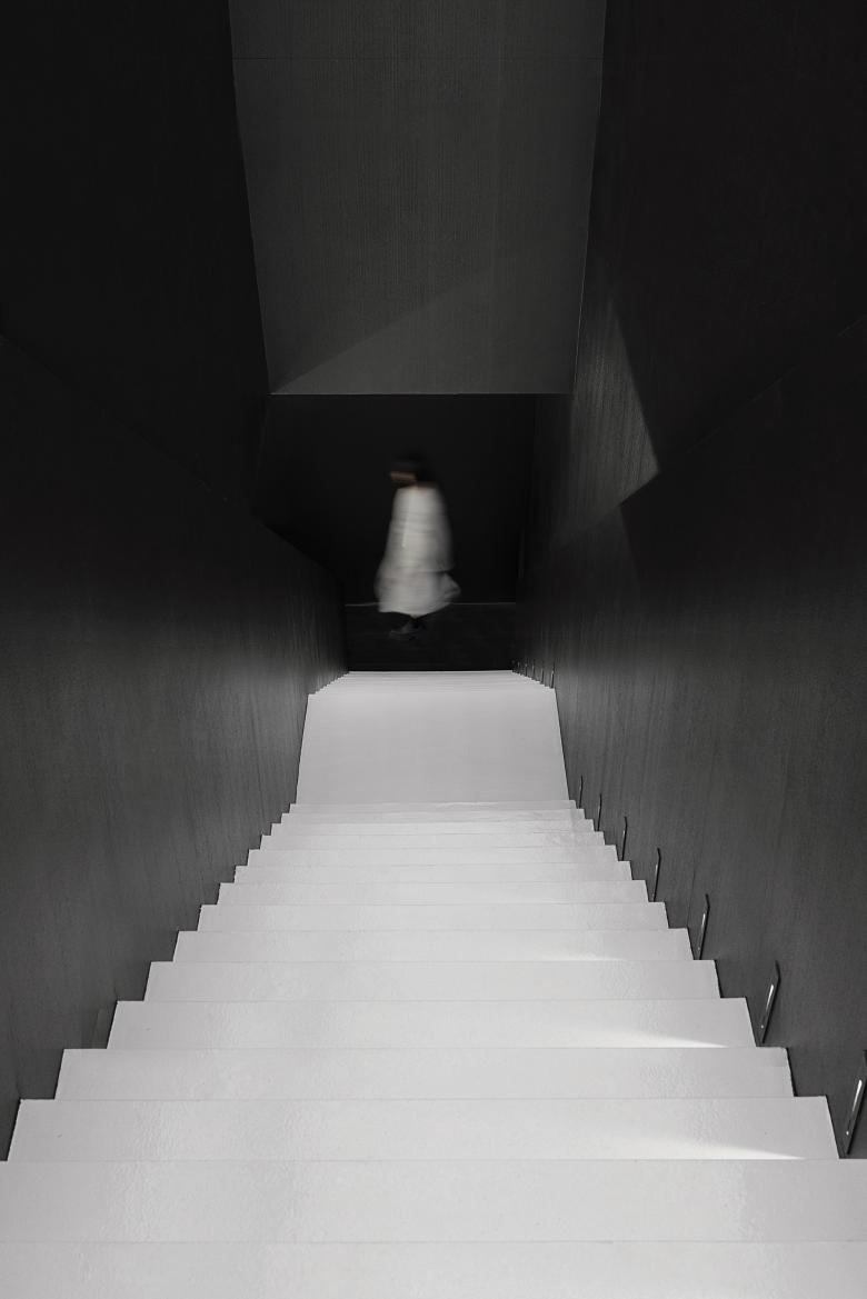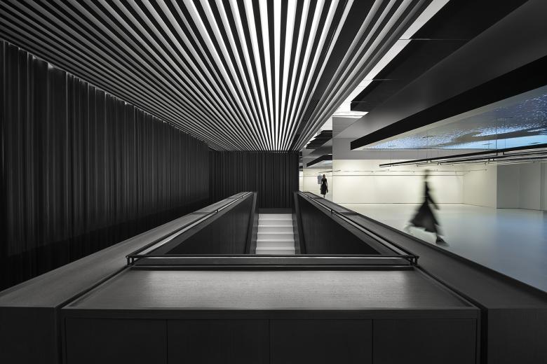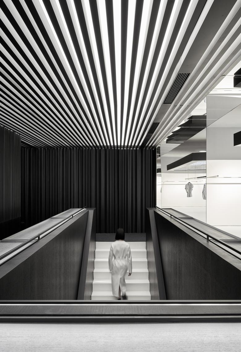 The cool lighting and strip structures on the ceiling reveal the perfect balance between function and atmosphere. The pure white light guides customers to go upstairs in the darkness. The layers and energy of light add noticable charm to the space.