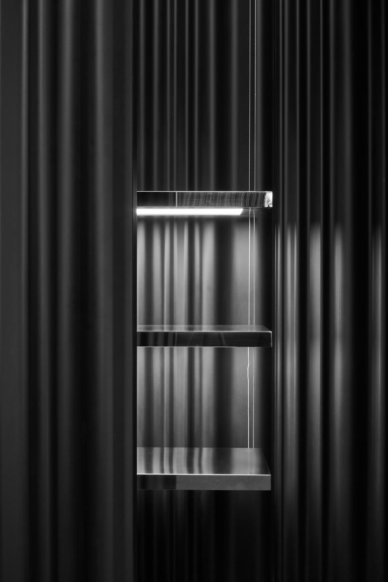 Mirrored shelves are suspended in the black background with rich layers of light and shadows. The light shines on the black "waves", creating gentle, changeable and exquisite visual effects.