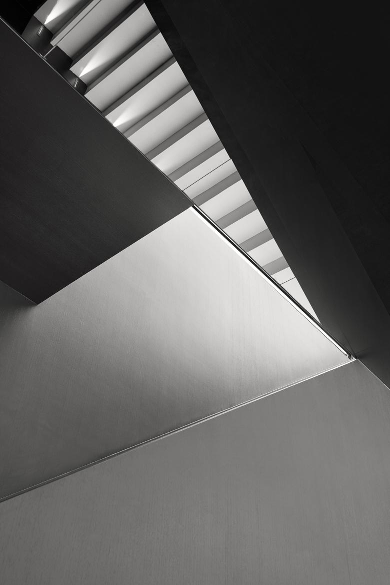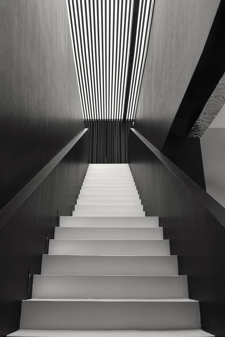 The staircase leading upwards is dominated with black and white, and is characterized by a strong sense of layering and a dramatic contrast of brightness and darkness.