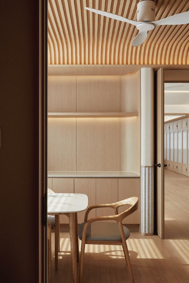The second stage to switch the mood is in the training area, where bright natural light comes from the large windows. Light filtering through the rolling curtain, with the reflection of the large-scale mirror, and touch on the wooden finishes, give the entire training area a gentle and relaxing feel.