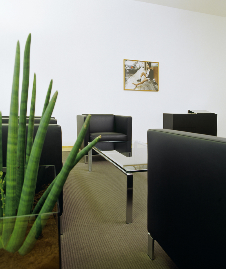 Die Differenzierung von Kunden- und Mitarbeiterbereich entsprechend ihrer Nutzung erfolgt durch räumliche Entflechtung und eine darauf abgestimmte Oberflächen- und Lichtgestaltung. Weiche Teppiche, Holz und Leder prägen den Empfang und die Kunden-Besprechungsräume. Hochwertige Beschichtungen und Textilien bestimmen die Arbeitsräume. Kommunikationsbereiche und offene Arbeitsplätze ermöglichen den modernen Bürobetrieb. Farbige Lichtakzente beleben die innen liegenden Gänge.