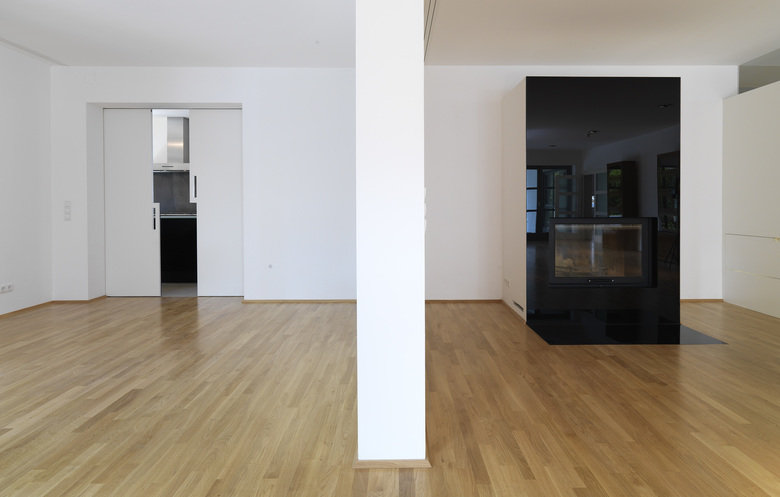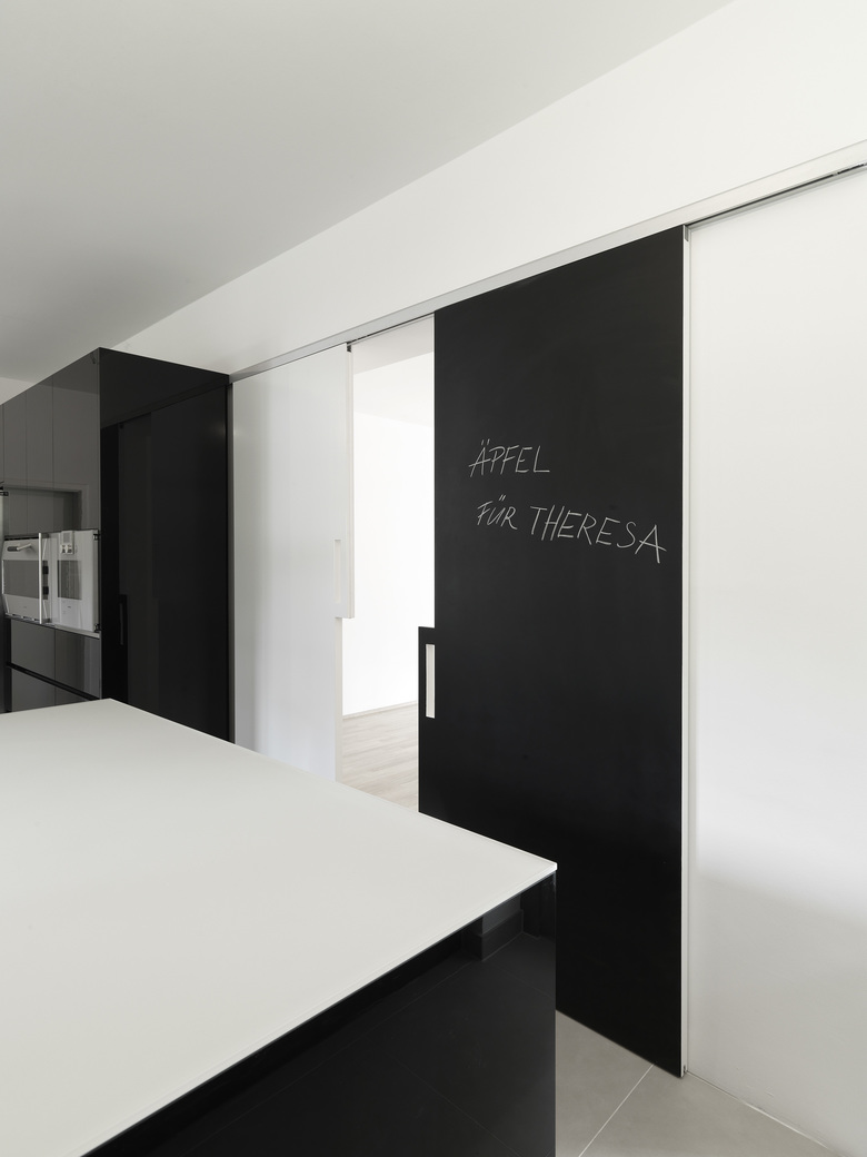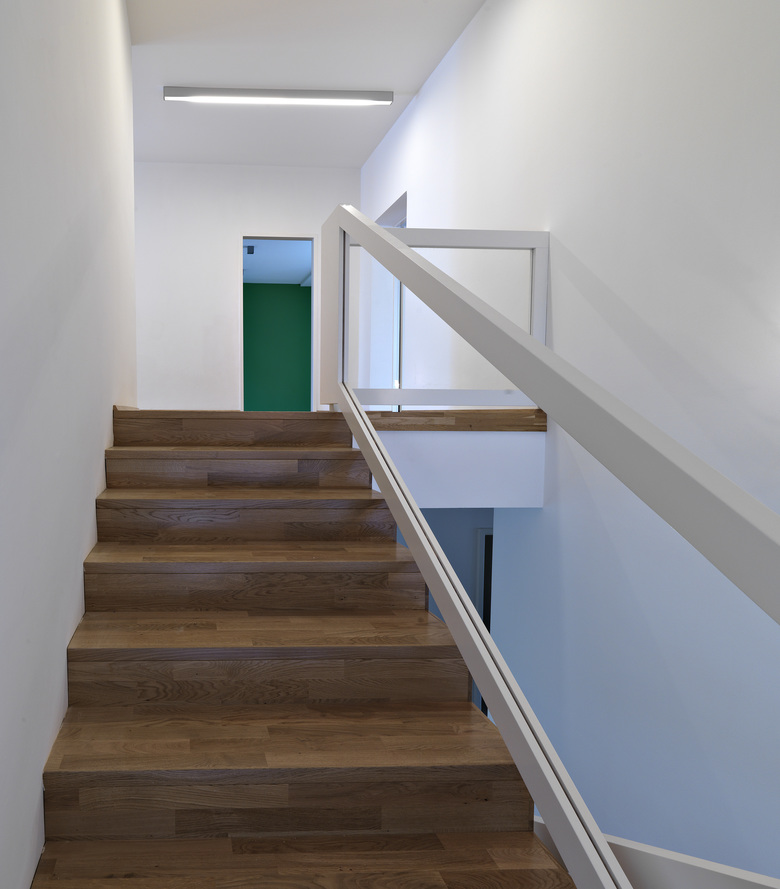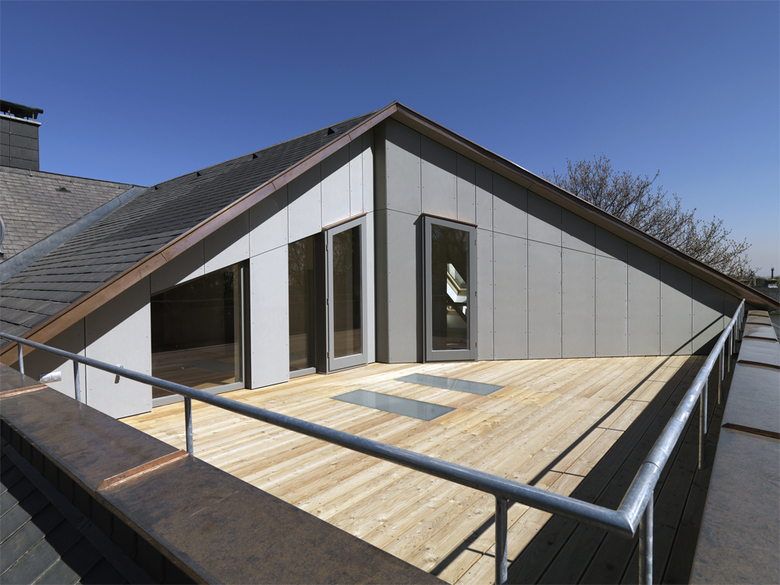 Neue Wand- und Fassadendurchbrüche dienen einer optimierten Lichtführung und unterstützen Raumzusammenhänge. Um die bestehende Kubatur, die wesentlich durch die Dachausbildung geprägt wird, in ihrer Form nicht aufzulösen, ist die neue Terrasse eingeschnitten. Der darunter befindliche Außenbereich erhält mittels Glasböden zusätzlich Licht. Diese Helligkeit wirkt in den Wohnraum hinein.