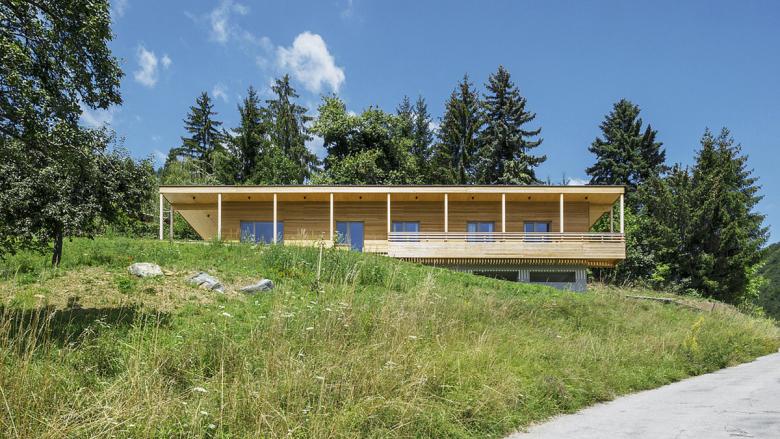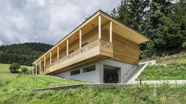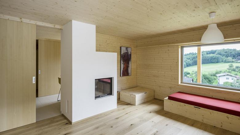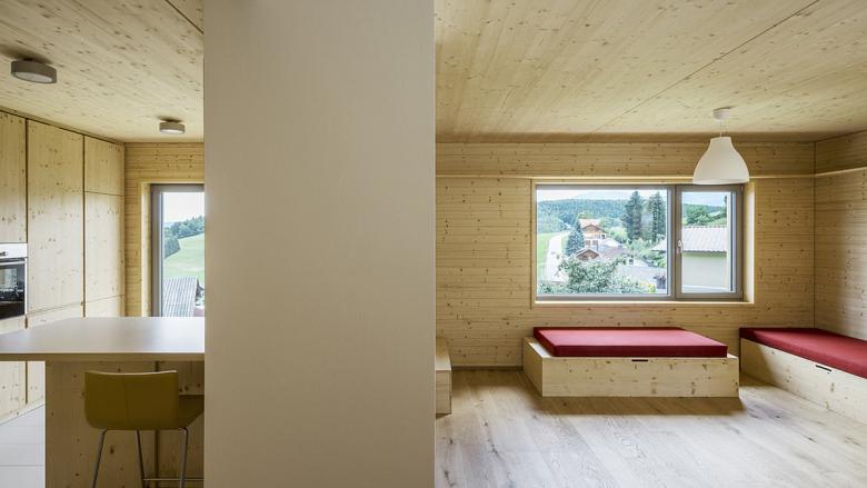 Die Konstruktion aus Brettschichtholz steht auf einem zur Straße offenen Betonsockel, der als offene Garage und zur Unterbringung haustechnischer Anlagen genutzt wird. Im Gebäudeinneren bleibt der Holzwerkstoff spürbar.
