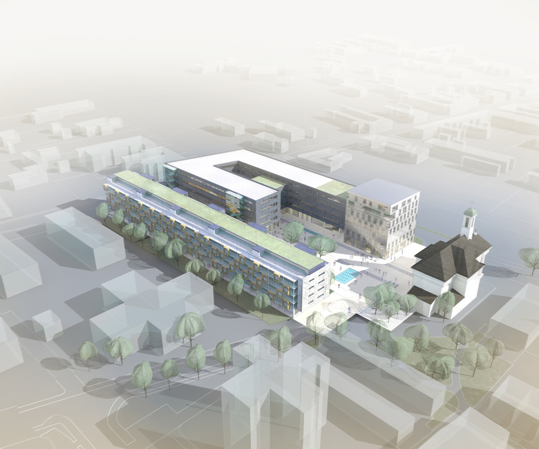 Entwurf des Rathauses mit einem Bürgerzentrum, Geschäfts- und Gastronomieflächen, sowie Büro- und Wohngebäuden.