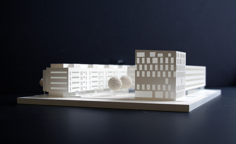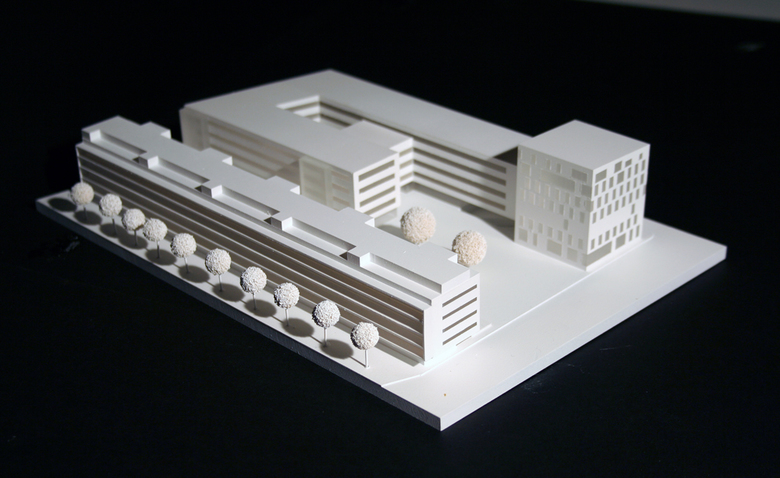 Ein vielseitig nutzbarer Platz ist gegen die Verkehrsflächen im Norden und Osten durch den Bürobau abgeschirmt und begrenzt das anschließende Wohngebiet durch einen langgestreckten Wohnbau im Westen.