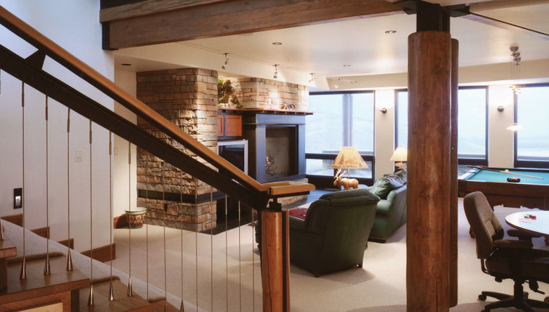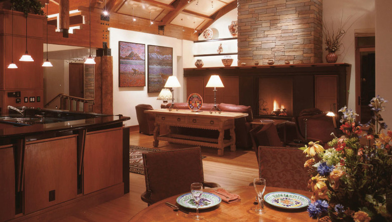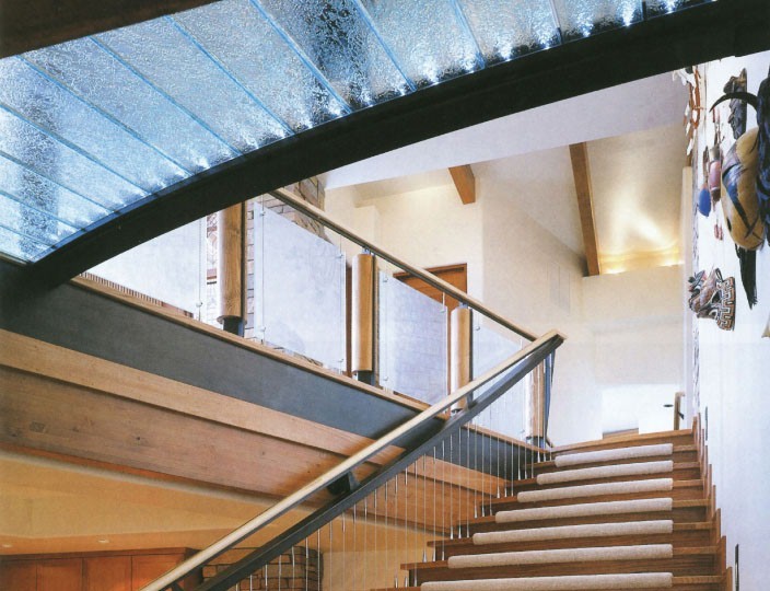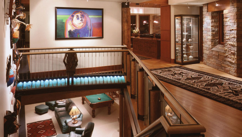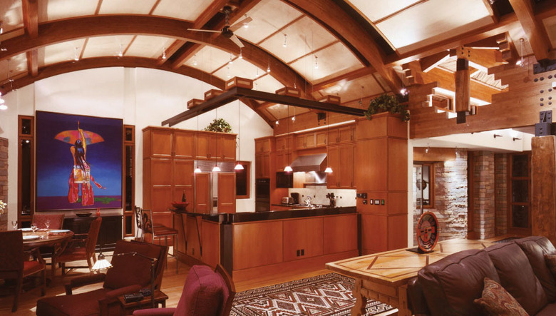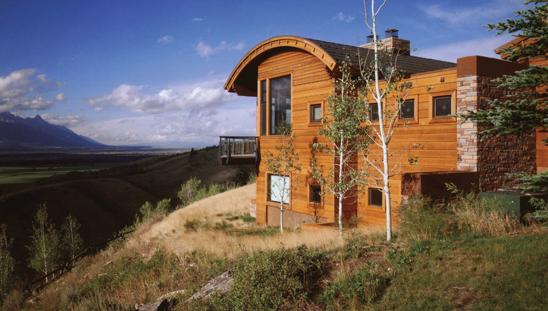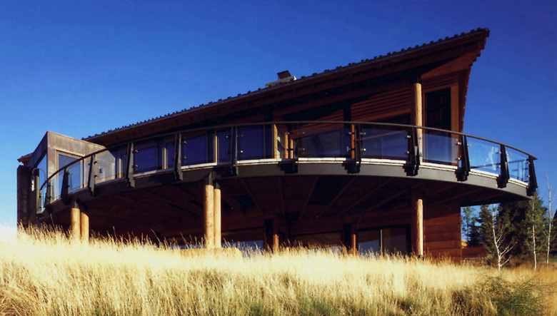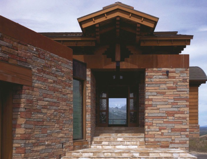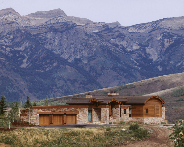 Contrasting forms complement one another in an asymmetrical low-slung design intended to maximize viewshed while minimizing impact on this highly-visible, panoramic site. Architects accomplished the dual feat by employing distinctive formal elements with a muted earthy traditional material palette. The formal composition of converging disparate shapes culminates on the north-facing exposure where a jagged, Teton-like triangular roofline contrasts sharply with a swooping glass-and-steel railing and semi-circular porch. Interior spaces play off the stunning effect with floor-to-ceiling windows that fill the vertical planes. The entry hall, which greets visitors with a view of the Grand Teton through a wall of glass across the barrel-vaulted living room, sets the tone for the experience, while interior features such as wood-wrapped steel columns that seem to float between levels and recessed ceiling panels that deemphasize horizontal massing reinforce the design’s overall buoyancy.