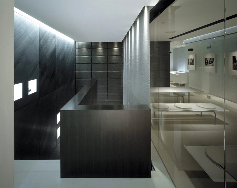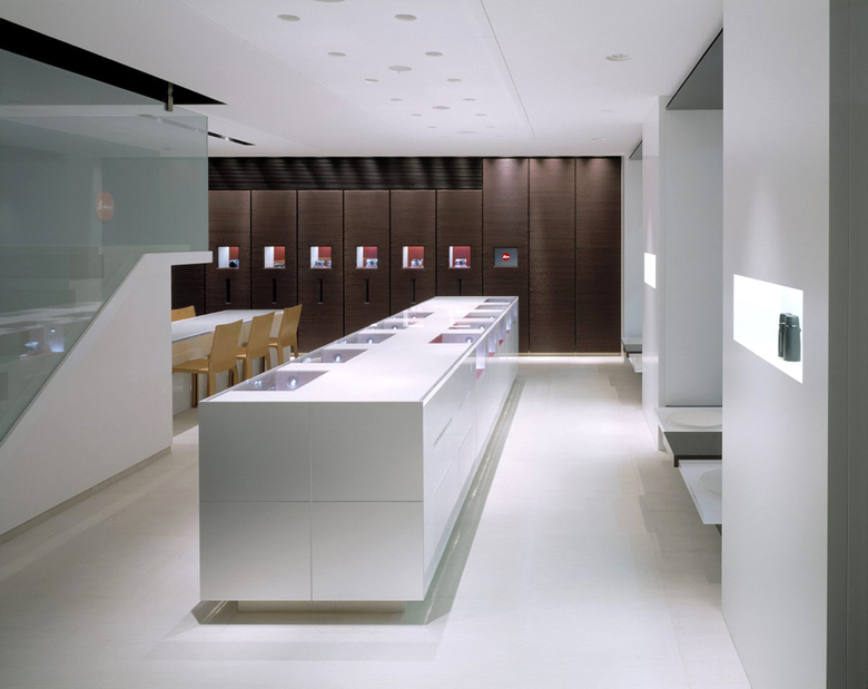 For this shop, I wanted to bring a timeless material quality to this space, because this is a shop for Leica. So, I chose a material palette that would likewise endure: glass, stone, metal, cloth and acrylic, as well as materials well known for their modern quality, like iron and aluminum. With these materials, I tried to create a finish that would be unique.