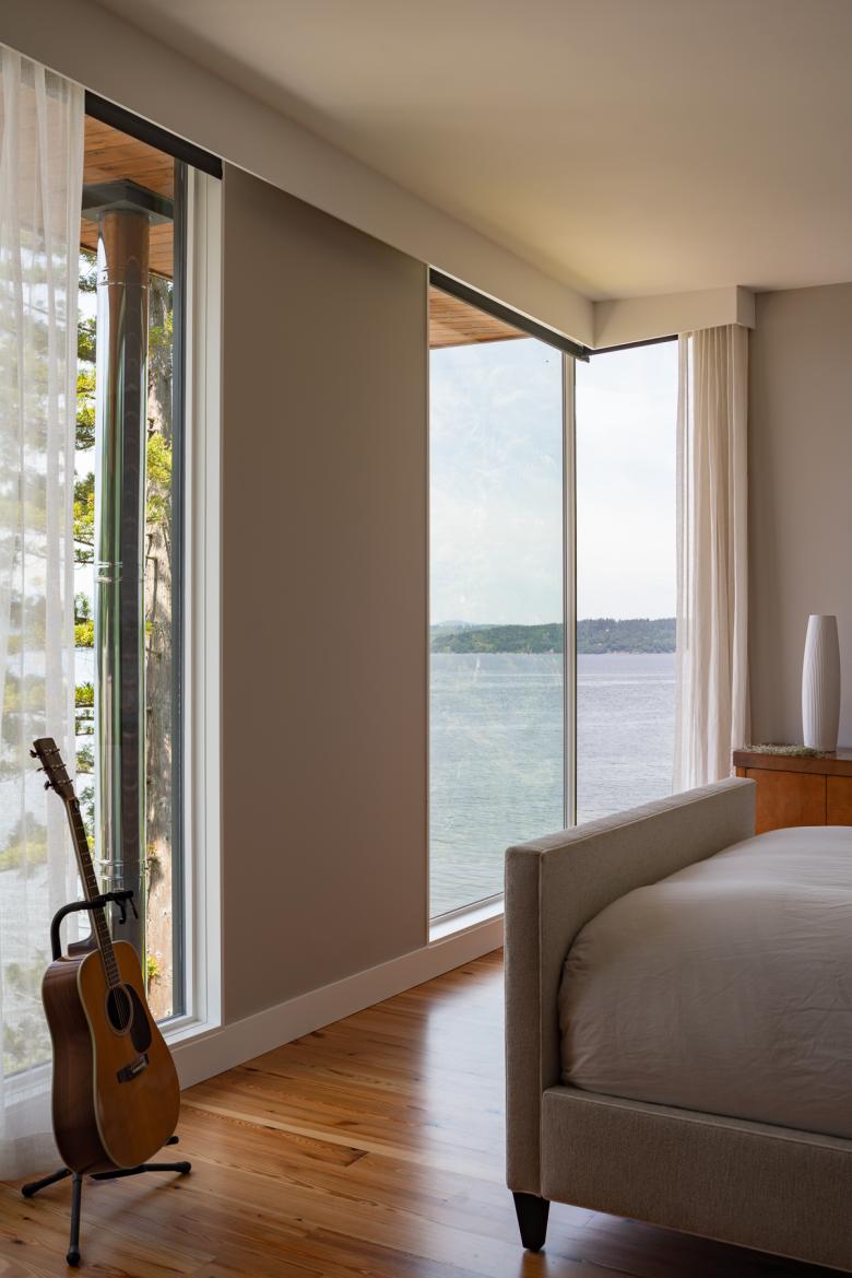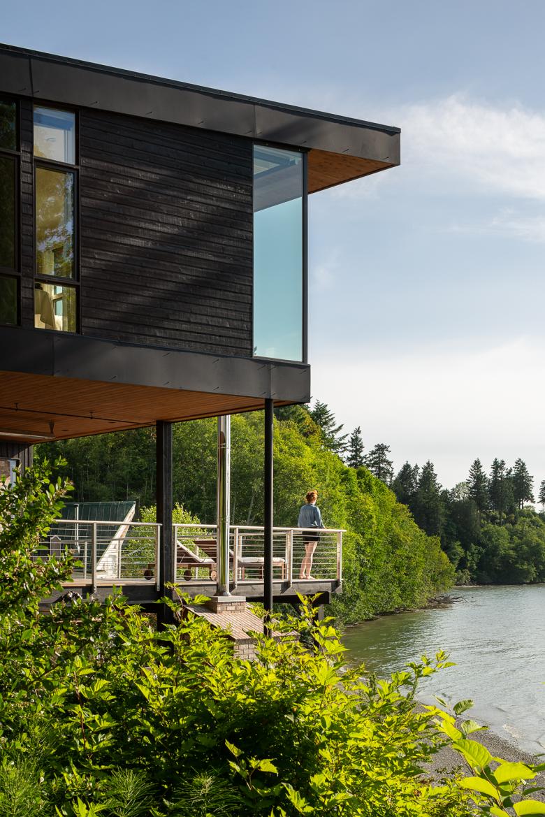 The house represents a regional northwest problem of building on fragile shoreline. “Due to the complex constraints of the shoreline exemption, we kept to the existing footprint, expanding the house only from the existing structure,” says Matt Wittman, Principal at Wittman Estes. “As a result, all new square footage is supported by compact pier foundations on pin piles.”