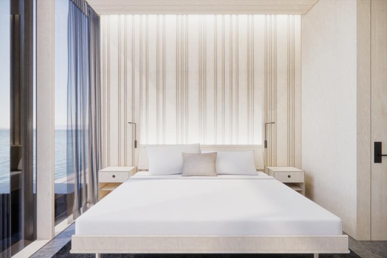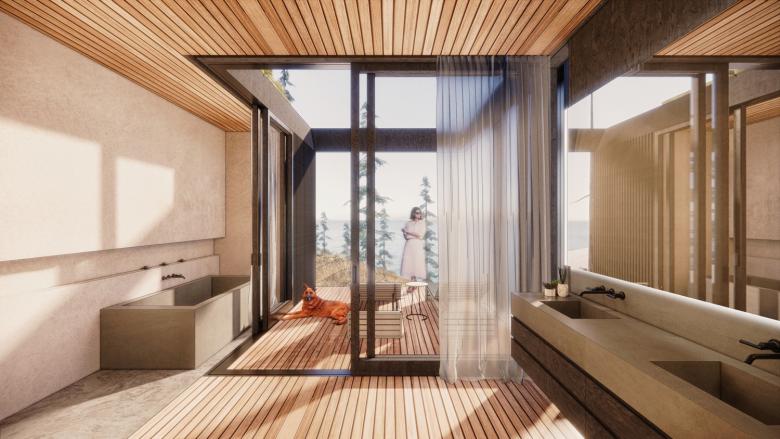 The secluded waterfront retreat takes advantage of the temperate Pacific Northwest seasons. In the warmer months, the sliding doors and full-height glass blur the line between interior and exterior, extending the living space to the outdoors. In the windy colder months, the residents can be indoors looking out, warmed by birch plywood and a fireplace, providing a place of refuge for family activities and gatherings. In the warmer summer months, sliding doors open and encourage the family to be outdoors on the open-air terraces. The primary bedroom and bath open to the east to welcome the morning sun. The dining terrace and living room orient to the west to enjoy the setting evening sun.