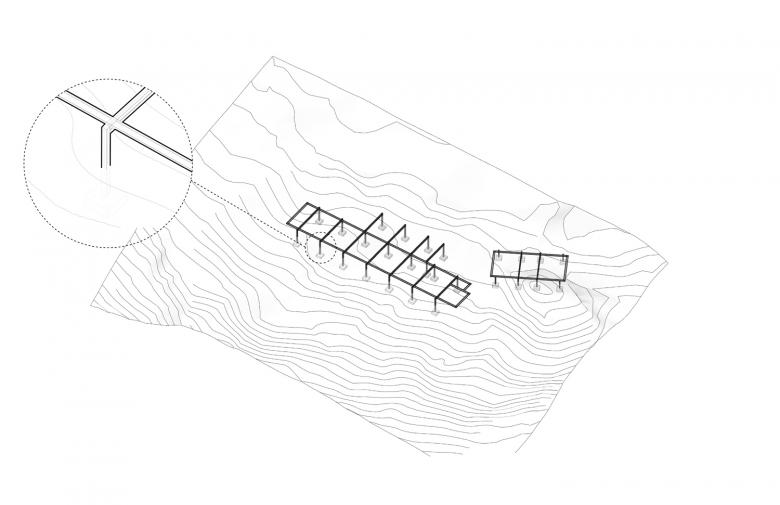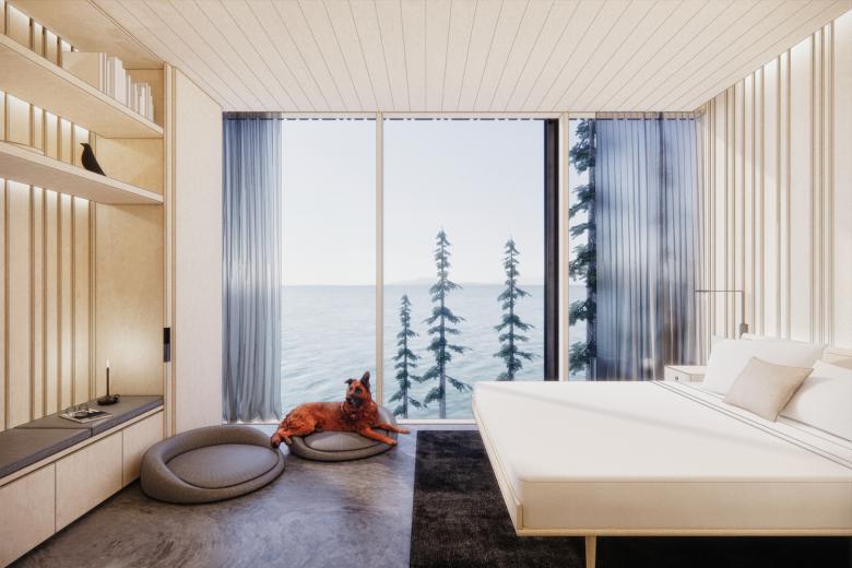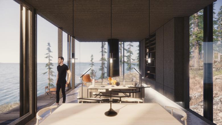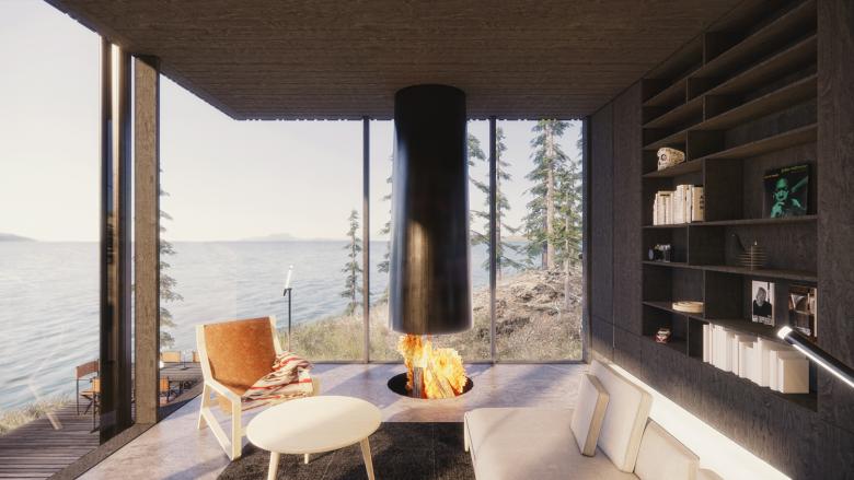 The careful arrangement of the program considers the delicate rocky ecology of the steep shoreline and the difficulty of getting typical construction machinery to the site. The house will be prefabricated offsite at a shipyard in Ballard, a waterfront neighborhood in Seattle. Grid-ordered steel frames are designed as on a 12-foot rhythm, based on the width of the house and the weight limitations needed for transport. The modules will be delivered by sea via barge and lifted onto its minimal, point foundation system with a helicopter.