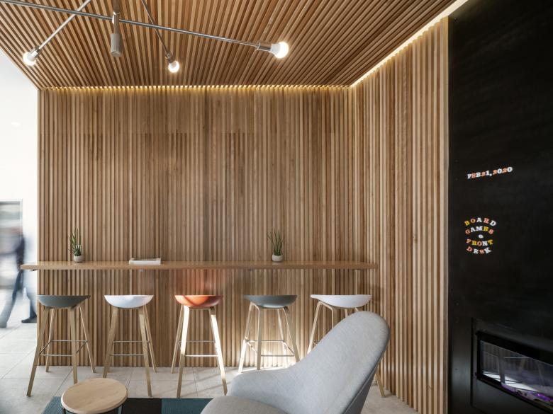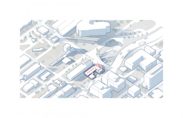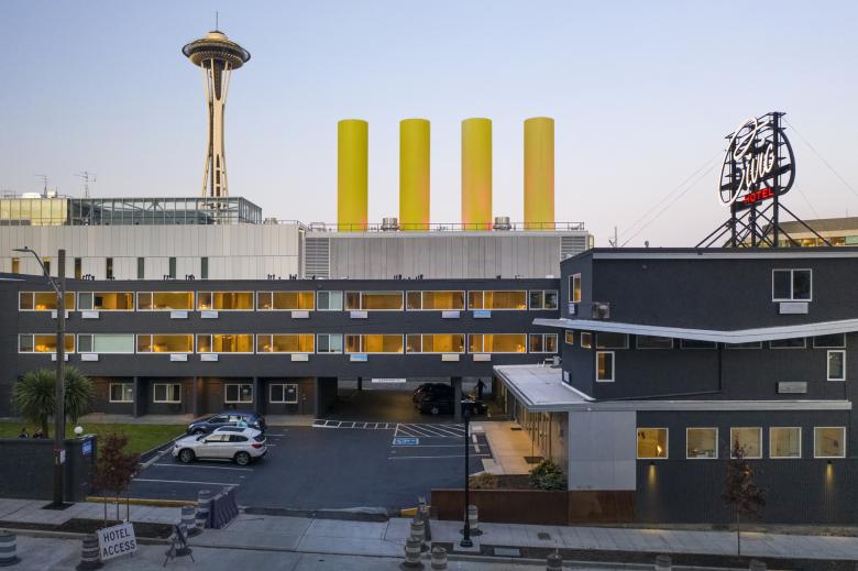 Standing three stories high, the transformed 27,433-square-foot building comprises 52 guest rooms. On the ground level is a lobby and event space, while on the second level are 26 guest rooms and a gym, and on the third level are additional 26 guest rooms. A rooftop Sky Lounge is planned for a future phase. The original hotel had been poorly renovated over the years, masking the original bones of the architecture and turning inward to avoid the noise of SR99/Aurora Ave. The existing lobby was dark and disconnected from both the surrounding cityscape and the guest rooms above. With the new tunnel placing the highway underground, the hotel owners sought to take advantage of the lower noise level and create an indoor-outdoor experience on the lobby level where the city's energy and pedestrian activity could be embraced by guests and travelers alike.