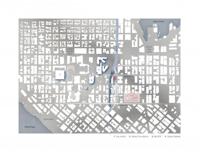 Located between the iconic Space Needle and the rapidly transforming South Lake Union neighborhood in Seattle, the Civic Hotel is a newly renovated boutique hotel at the corner of Harrison Street and Aurora Ave N. The site is at the nexus of the newly reconnected street grid where the hotel marks the north entry of the recently re-opened SR99 tunnel. Originally named the Imperial ‘400’ Motel and built in 1962 for the Century 21 World’s Fair, the building has been reimagined with modern interiors and outdoor spaces in the spirit of jet travel, optimism, and a distinctly Seattle blend of technology and nature. Building on themes of lightness, speed, flight, and connections with nature, the design is fresh and bright, stylish and relaxed.