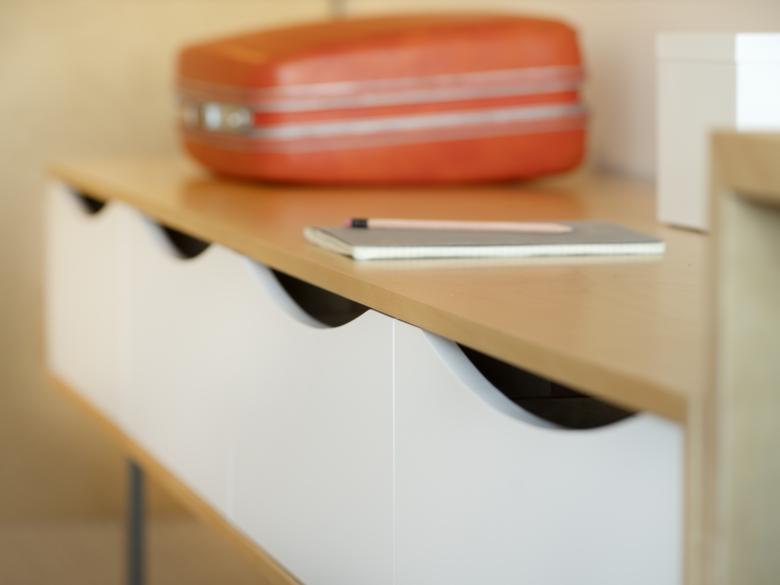 On the upper two levels, the guest rooms are accessed via brightly painted yellow doors, balancing the necessity of a memorable interior with the need for a cool, sensory retreat. “The key to hotel rooms is to balance art and commerce,” says architect Matt Wittman. “We wanted to select materials that will last for a long time yet still bring a sense of luxury with them.” Wittman Estes also custom designed plywood furniture to echo the hotel’s mid-century history and bring a sense of warmth to each guest room. The custom furniture pieces include the bed headboard, nightstands, desk, credenza, and storage cabinet.