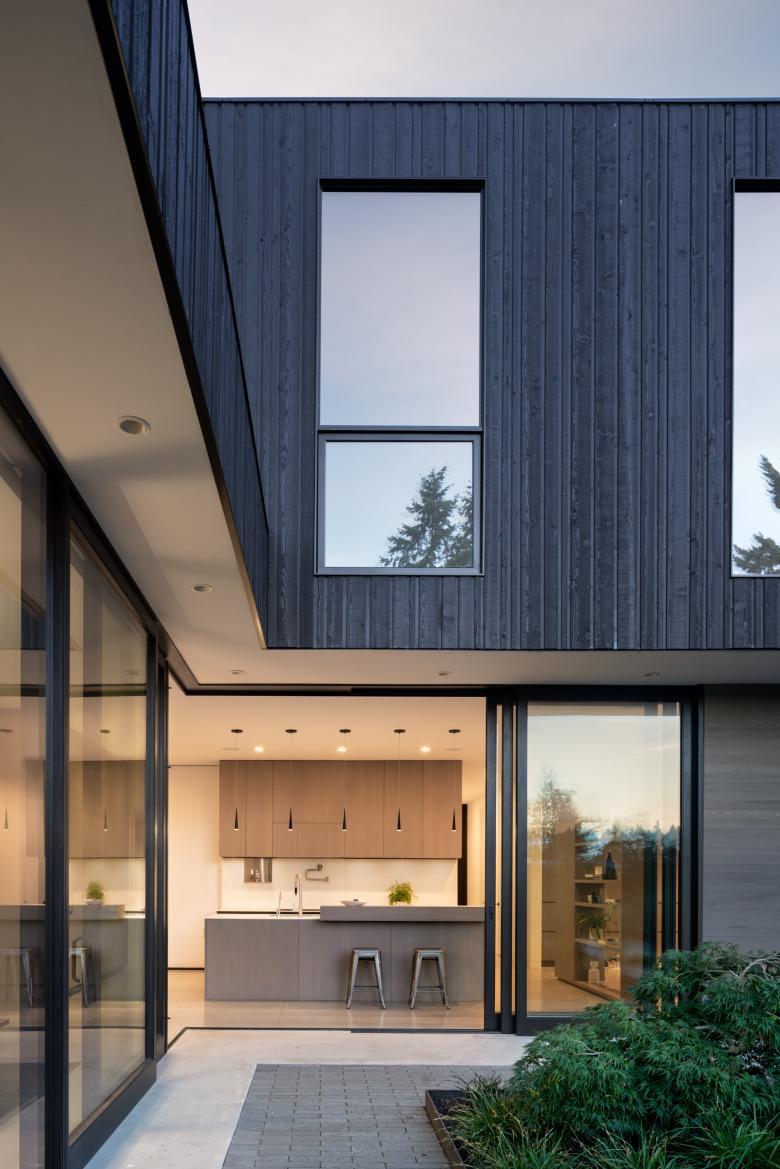 The design is organized in three elements: 1) the entry courtyard, which is screened from busy NE 24th Street; 2) the house living volume, which presents an opaque facade to the street, and a transparent facade to the rear; and 3) the garden courtyard, which is composed of a secluded zone in the rear yard where children can play freely. The courtyard house connects space with nature. The entry courtyard functions as a threshold between the street and the interior. A black-stained, tight knot cedar fence marks the next transition as a concrete path moves through a bed of grasses and a Japanese Maple tree. Inside the secluded garden courtyard, all signs of urban life disappear within the oak casement of the kitchen, concrete flooring, and floor-to-ceiling sliding doors.