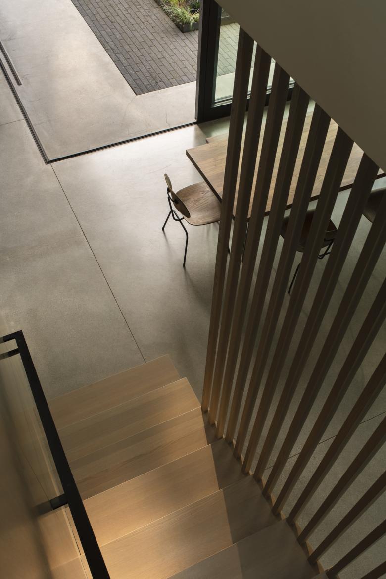 By creating the illusion of large spaces that seamlessly transition to outdoor views, the house used one third less of a footprint than was allotted. Chinese landscape paintings employ a “atmospheric perspective” technique to enhance the perception of depth of space. Yo-Ju uses this technique to create “visually larger spaces than what actually exist—the eye marks the level of oak stairs, then the large sliding doors, finally reaching the garden courtyard beyond,” says Matt Wittman. This spatial efficiency help shape a new model for suburban housing—a decreased footprint that allows for maximum energy savings and increased planting area, privacy, and views into nature.