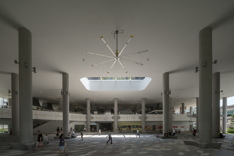 The People’s Plaza is a fully public, porous and pedestrianised ground plane, designed as a community living room, within which the public can participate in organised events, join in the season’s festivities, shop, or eat at the hawker centre on the 2nd storey. The breezy tropical plaza is shaded and sheltered by the Medical Centre above, allowing activities to continue regardless of rain or shine.
