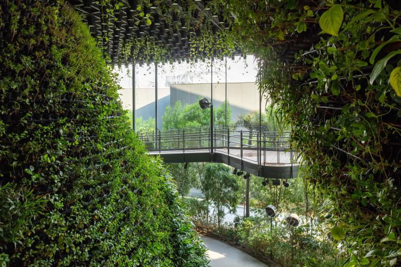 The Singapore Pavilion houses over 170 varieties of plants which will grow to be even more dense and lush over the Expo period. Besides giving visitors a beautiful biophilic experience, the plants provide measurable ecosystem services like solar heat reduction, sequestration of greenhouse gases, reduction of other pollutants such as PM10 particles, oxygen production, rainwater remediation as well as providing habitats for animals.