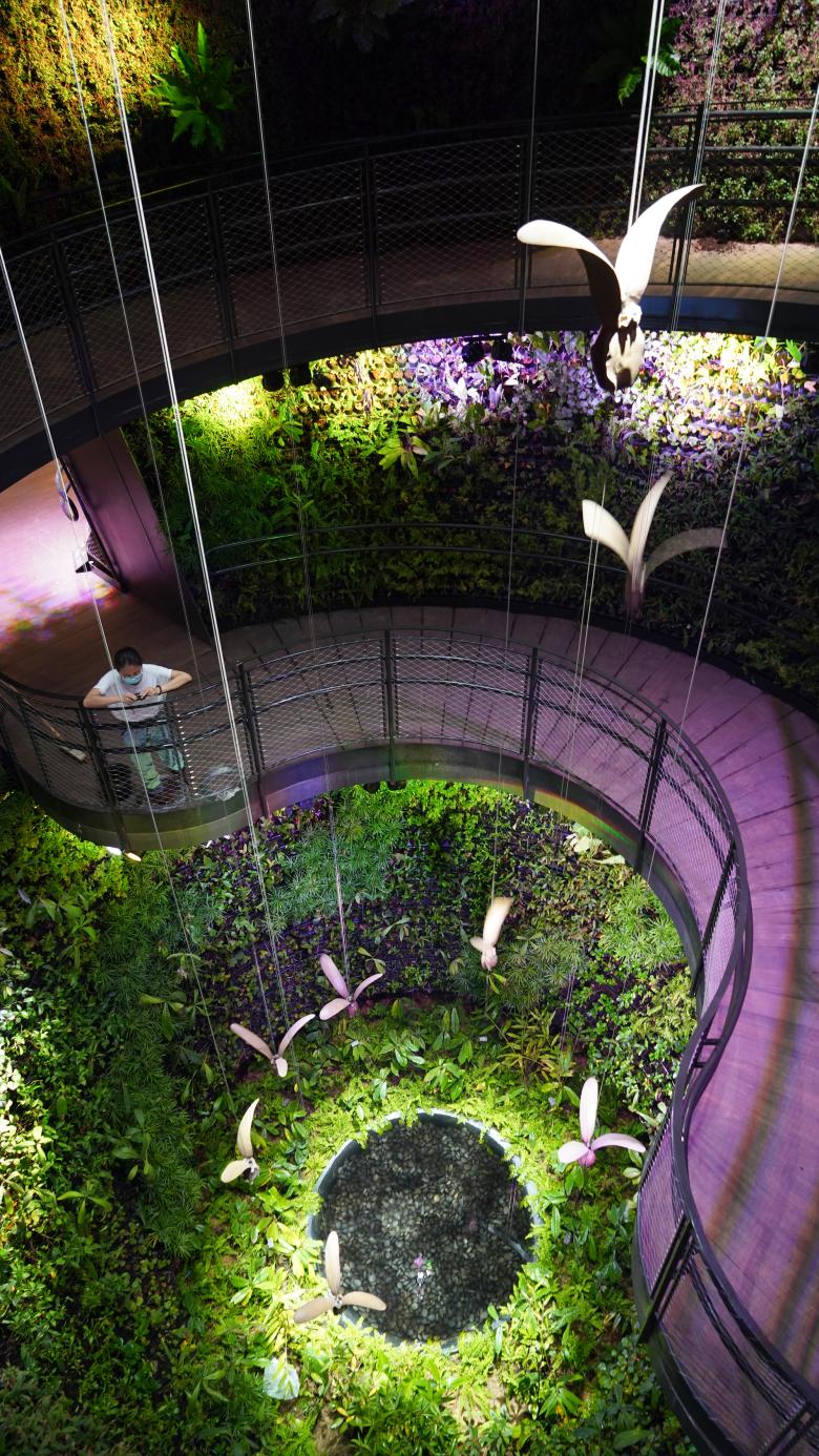 To maximise the usable site area, the design takes a layered approach, stacking multiple levels and functions on top of each other. Visitors will go on an experiential journey by following the canopy walk that meanders through the pavilion’s multiple levels while being surrounded by verdant palms, trees, shrubs and vibrant orchids. The Hanging Garden as well as three thematic cones that are draped in vertical greenery add to this immersive, three-dimensional biophilic experience.