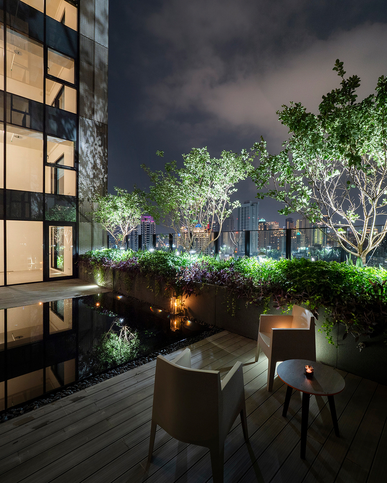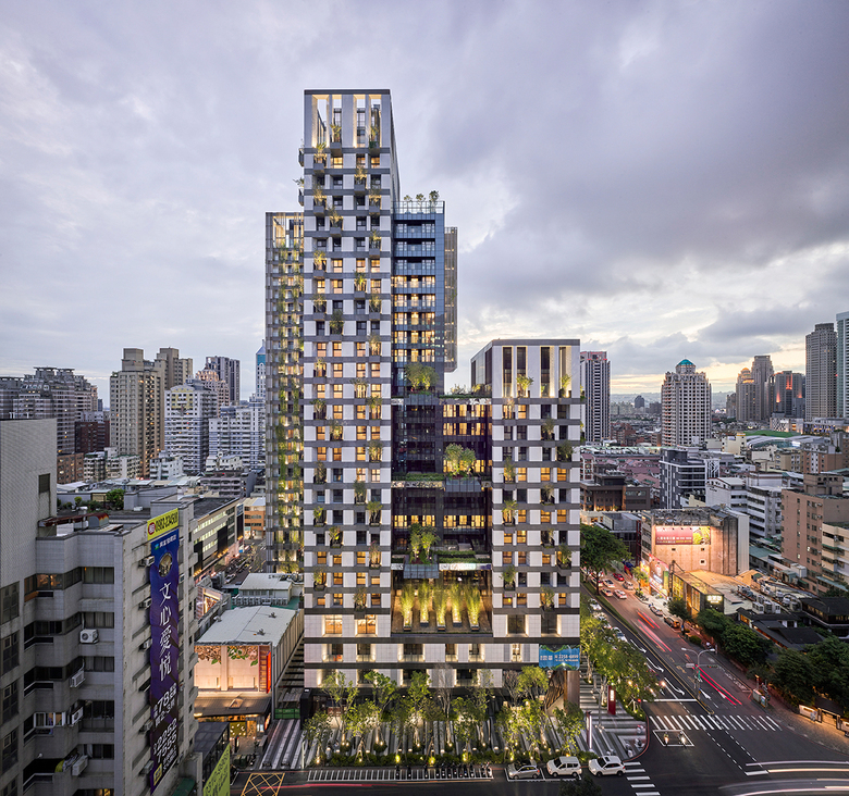 Sky Green is a mixed-use development located at the heart of Taichung in a densely developed and vibrant neighborhood. The site is made up of two rectangular plots, one facing the main city thoroughfare, Gongyi Road, and the other facing Naying Street, a quieter secondary street. The development consists of two 26-storey residential towers with apartment units from level 4 onwards, as well as retail spaces. To connect to its setting, and the hustle and bustle of the streets, the building’s retail spaces are located from ground level to level 3. The shops have staggered patterned glass cladding to give an urban backdrop to the tree-lined pedestrian walkways and modern outdoor street furniture.