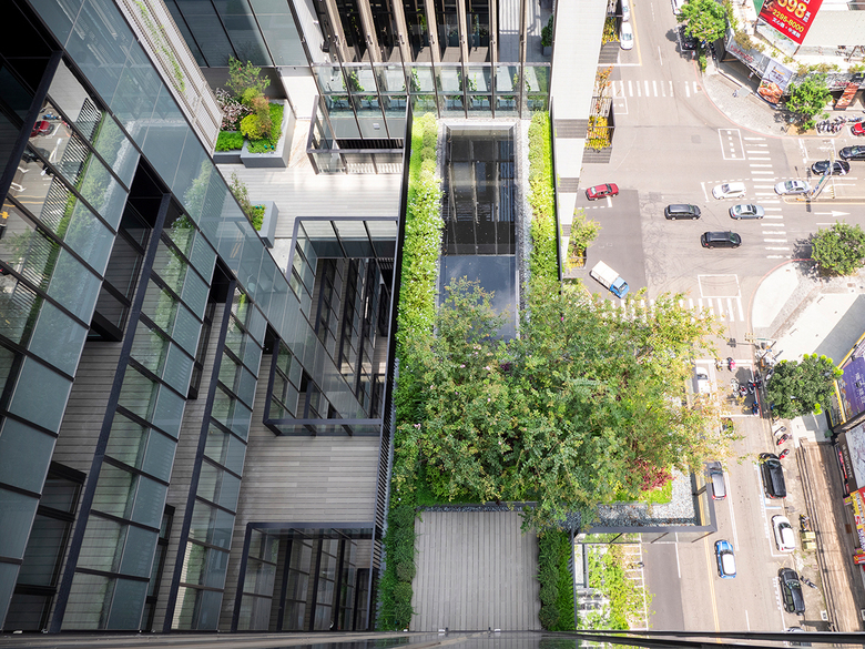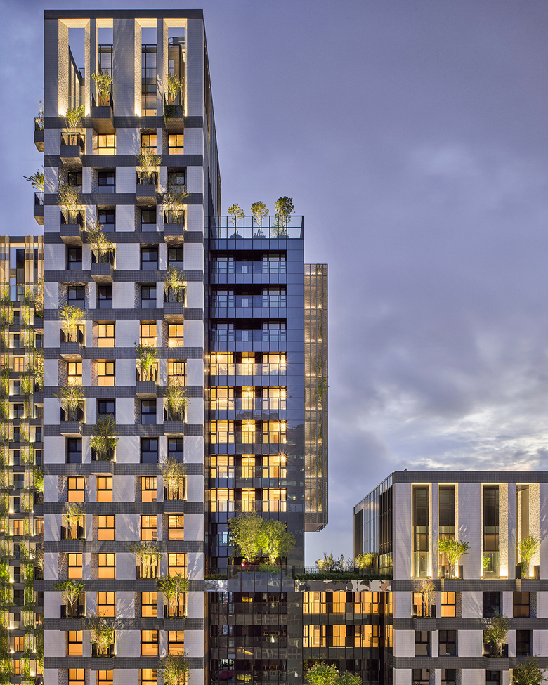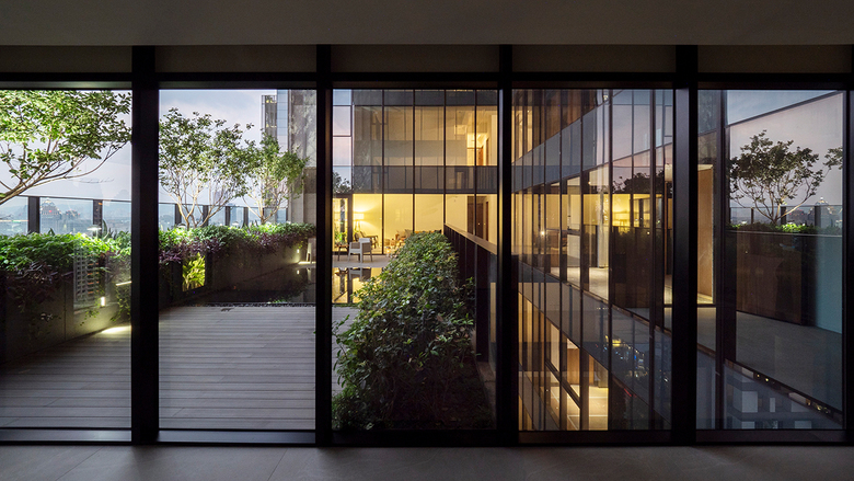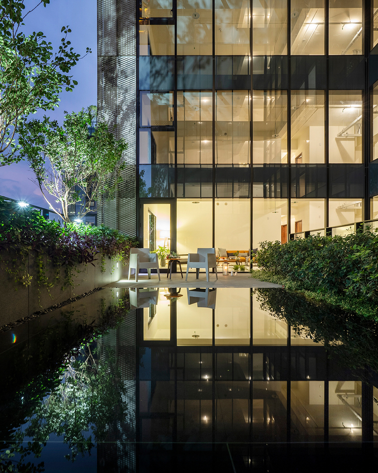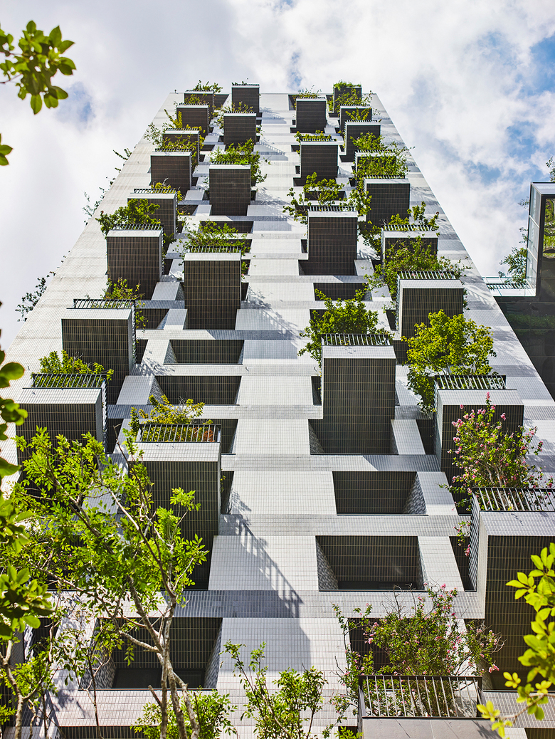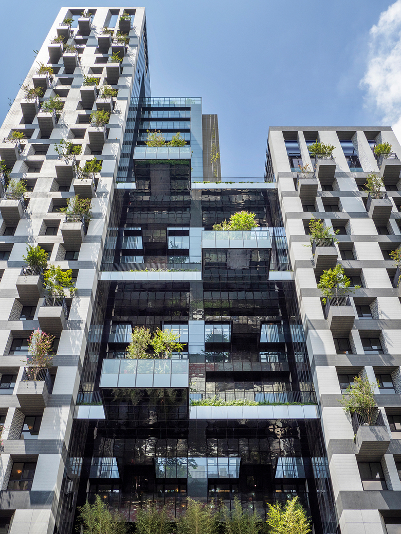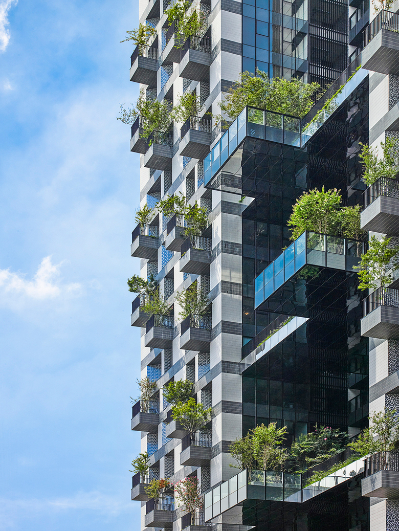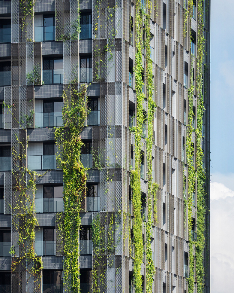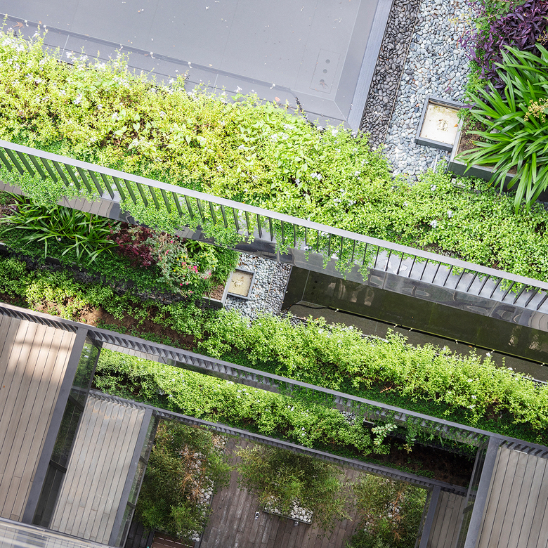 Away from the busy street life an intimate, serene landscaped courtyard greets the residents as they return to their homes. Above the retail shops rise the two residential towers as well as generous recreation facilities for indoor and outdoor activities. Both towers have deeply recessed windows and the façades are enveloped with protruding balconies with trees, sky gardens and mesh screens that serve as a trellis for green creeper plants. Landscaping is treated as a key material in creating the building envelope for the residential towers. The façade elements create deep sun-shading and the greenery acts as an active and living interface between the interior and exterior environment.