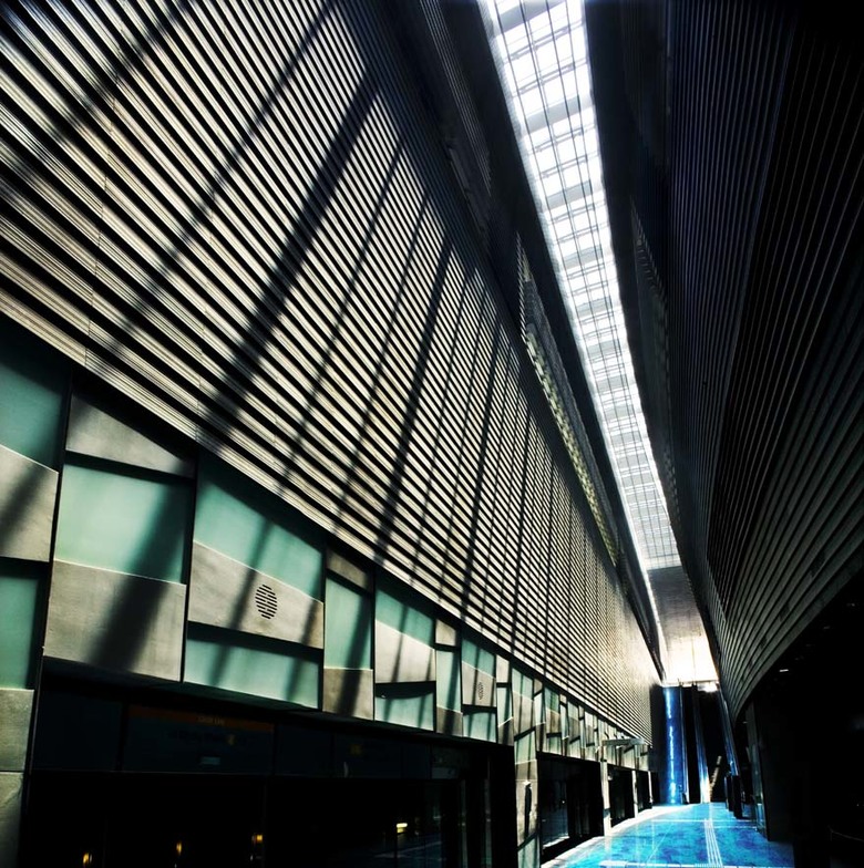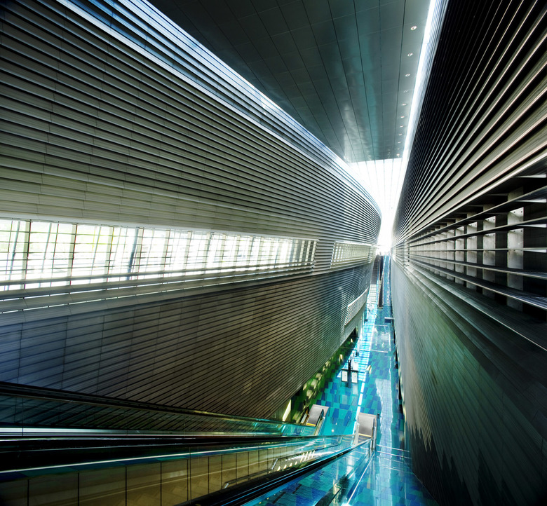 Inspired by landscape forms and the art of Richard Serra, the form of the station is generated both by the flow of crowds down into the station, and inflected by the massive, curved forms of the stadium. The design contrasts a linear element against a curved one. The interior of the station abstracts geological forms, creating a shimmering, glassy grotto below the opaque massive elements above. Pedestrian movement dramatizes perception of the space, as the escalators slide below the curve above, transporting commuters from the concourse at grade to the platform at basement 2.