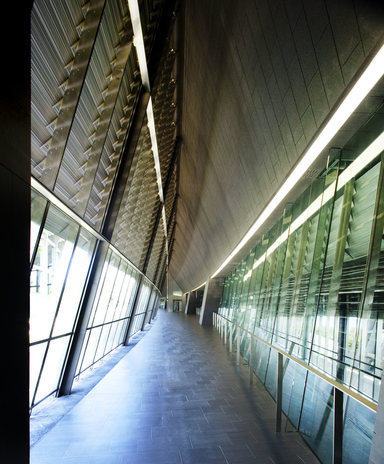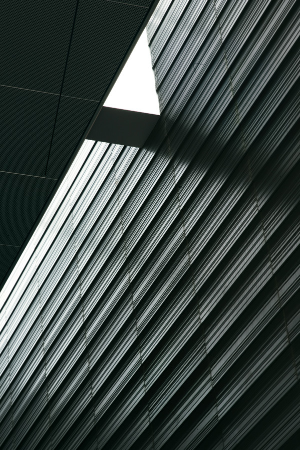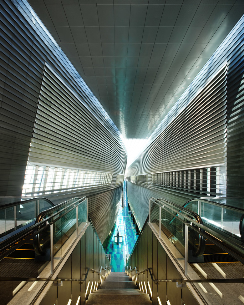 The station creates a major dramatic space that gives the public a moment of spatial grandeur in their daily commute, as traditional train stations in Europe do. A central skylight creates an attractive, day-lit platform. Openings in the above-ground forms allow views down to the platform from the ground level plaza. The ribbed aluminium cladding system was custom designed by the architects to create an ambiguous material, sometimes soft like fabric, sometimes hard like stone, sometimes metallic, that changes with the quality of light and the time of day. A single extrusion can be orientated 4 ways to create endless variation in the relationship of the panels. The grey, stepped, curved forms preserve a memory of Singapore’s National Stadium, now demolished.