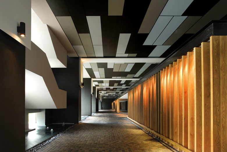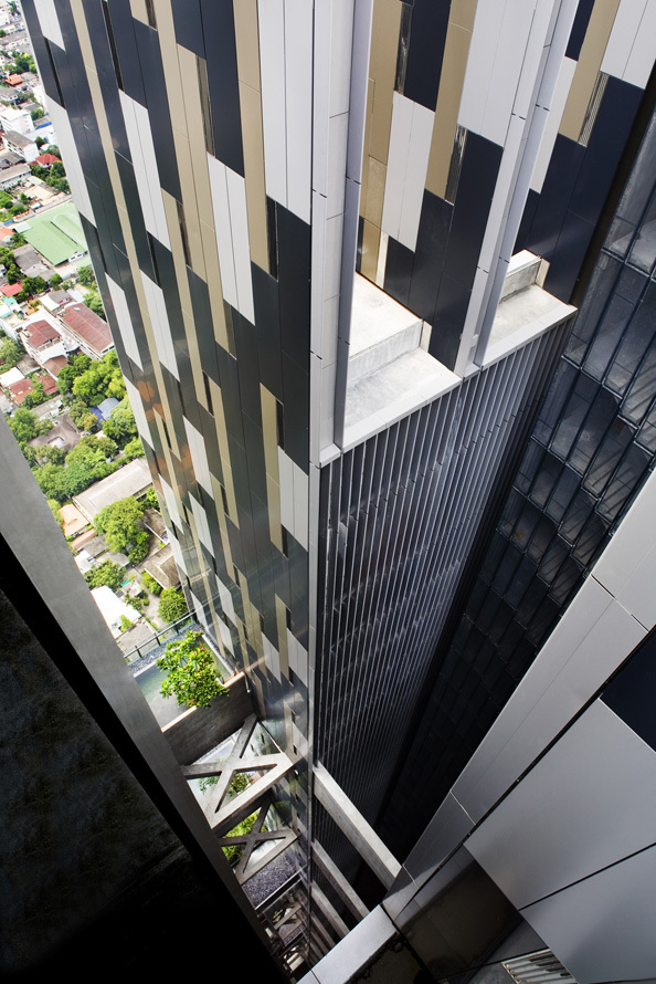 The design is inspired by Thai forms – ceramic tiles, textiles and timber paneling, abstracted and used as a way to organize forms. The cladding, for instance, uses temple tiles as an inspiration, while the staggered arrangement of the balconies recalls the Thai teak staggered paneling on traditional houses. The walls incorporate random inserts of faceted polished stainless steel, a contemporary interpretation of the sparkling mirrors incorporated into Thai temples, returning this delightful glittering effect at a scale appropriate to the vast central city.