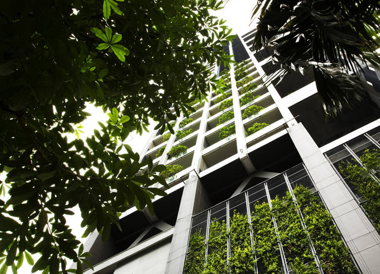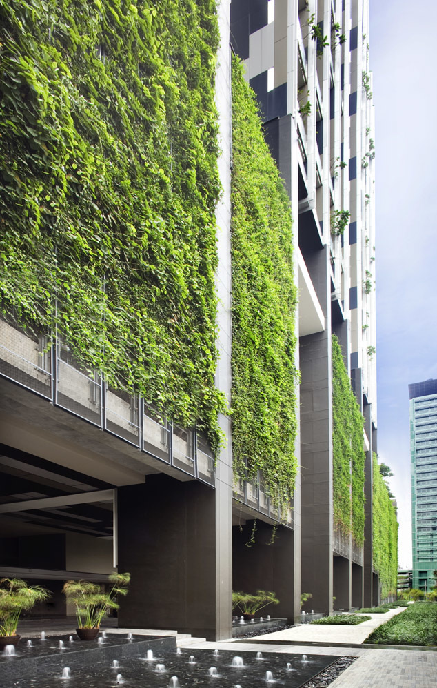 The building is planted on every horizontal surface. Additionally, vertical faces are shaded by green creeper screens, rising up the full 66 storeys. Balconies are provided with private planters. All apartments are cross ventilated, and all face north and south. The staggered block arrangement gives all apartments access to light and air on all four sides. The design encourages and makes possible living without airconditioning.