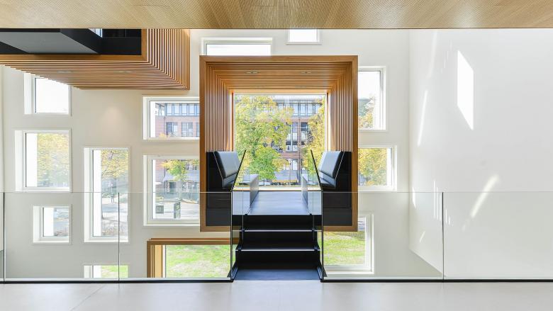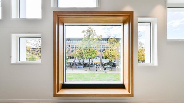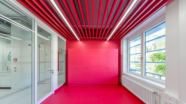 Die durch die Fensterrahmen bildartig in den Innenraum wirkende, bewegte Außenwelt schafft die inspirierende Umgebung für den wissenschaftlichen Austausch. Gleichzeitig öffnet sich der Innenraum nach außen in den Stadtraum und ermutigt das interessierte Publikum zum Betreten und Erleben des Forschungszentrums. Der Eingangshalle mit den Konferenzräumen lebt von einer reduziert-eleganten Atmosphäre, geprägt durch hellen Terrazzo, schwarze Wand- und Bodenbeläge und hochwertige Holz- und Glaselemente. Ein Kontrastprogramm erleben die Forscher:innen in den beiden hochmodernen Laboretagen, in denen sich jeweils eine auffällige, frische Farbigkeit in Blau oder Pink von Decken- und Bodenbelägen, über das Mobiliar bis hin zu den Sanitärbereichen zieht.